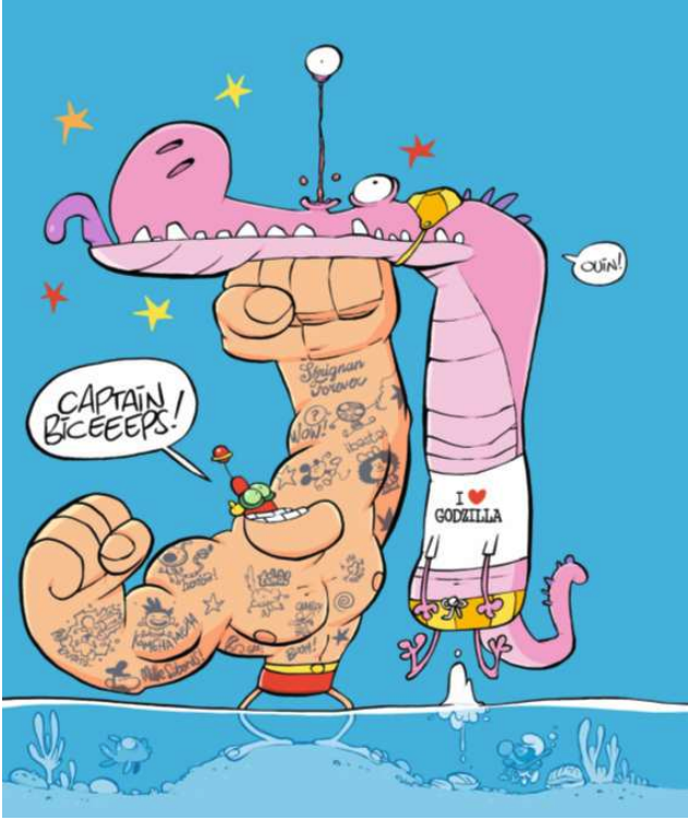 Fort du succès de son 30ème anniversaire, le Festival BD de Sérignan – qui a battu tous les records, en termes d’émotion, de partage, de diversité, de fréquentation – entre pour sa 31è édition dans un monde chahuté par la situation internationale, par la guerre, par les tensions permanentes qui portent atteintes aux droits des femmes et des hommes. Souvent satirique, la bande dessinée est un défouloir qui ne prend pas de gants pour dire les choses. La dérision est sa force et elle retourne toutes les situations pour dénoncer le ridicule et la bêtise humaine. Aussi, tout comme les super héros ont émergé avec la seconde guerre mondiale pour sauver le monde, Sérignan a choisi un super héros pour remettre de l’ordre dans ce 21è siècle, mais pas n’importe lequel le plus balèze des super-héros : Captain Biceps ! Sans oublier l’affiche signée par le président de l’édition Tebo. Captain Biceps en maillot de bain, tatoué, arborant un Sérignan forever, met une raclée à Godzilla. On retrouve ici toute l’énergie du dessin de Tebo, son dynamisme et son humour décapant. Une affiche pleine de clins d’œil à ses influences et amis de la bande dessinée en partant de Zep et Titeuf (Tchô), en passant par Dragon Ball, Spider man et jusqu’au petit Schtroumpf plongeant dans l’eau, clin d’œil de la BD qu’il vient de réaliser : Qui est ce schtroumpf ? (Le Lombard)