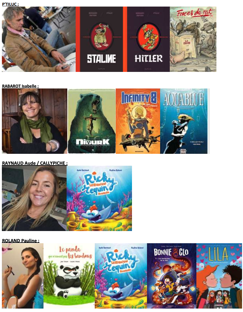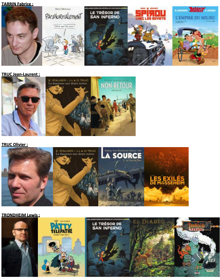 Sorties d’albums et nouveautés sur cette édition : Captain Biceps de Tebo (Glénat) ; Le joli monde de Finette. N’aie pas peur du noir, Philibert ! de Nadia Berkame et Alexis Nesme (Oxymore) ; Le Serment, de Mikaël Bourgouin (Glénat); L’Occupation des sols, de Guy Delisle (Gallimard) ; Seccotine. Vol. 1. Mystère à Champignac de Elric (Dupuis) ; Le syndrome de l’imposture de Fred Neidhardt (Dupuis) ; Les tuniques bleues, Lincoln dans la ligne de mire, de Fred Neidhardt (Dupuis) ; Patty télépathe. Vol. 2. (Bayard jeunesse) par Lewis Trondheim ; Spirou : Le trésor de San Inferno (Dupuis) de Lewis Trondheim et Fabrice Tarrin ; La danseuse aux dents noires (Dupuis, de Eric Stalner, J-L et O. Truc ; Miao Miao magic school. Vol. 1. Leçons de ronrons, Guillaume Bianco (Oxymore).