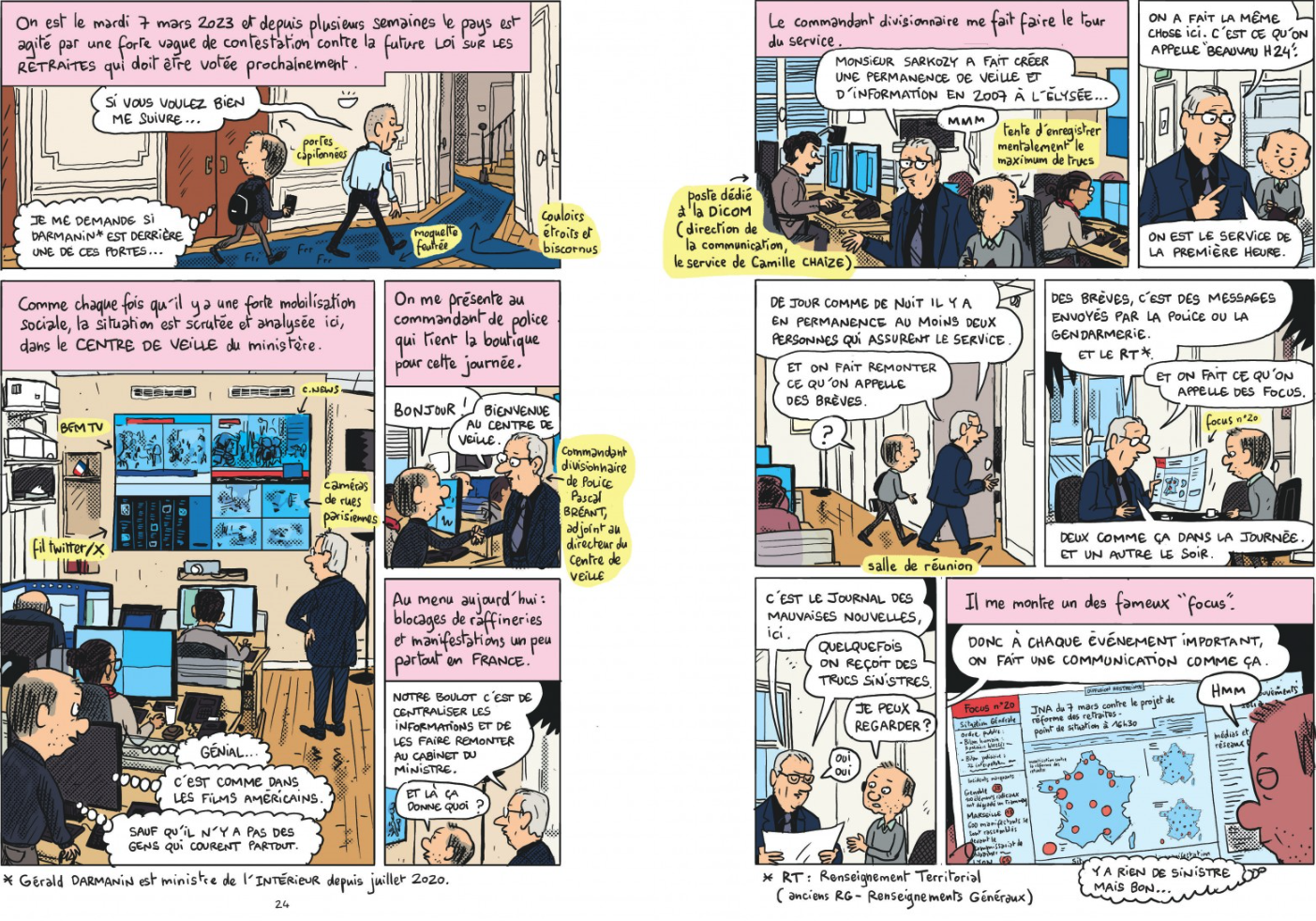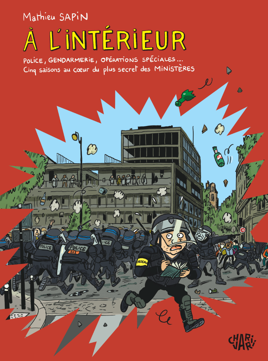 Par étape, Mathieu Sapin est d’abord allé en 2023 à Paris rejoindre « son unité ». On l’équipe, on l’harnache et a son garde du corps qu’il ne devra pas lâcher pendant la manif. Instruction rapide, il entame sa première journée d’action. On le prévient contre les Molotov, les cocktails. Et c’est parti mon kiki. Lacrymo dans les beaux quartiers devant la Closerie des Lilas, on court près de Cochin, c’est la chasse aux blacks blocks. Mais il en a assez vu Sapin. Stop. Une conseillère communication de l’Intérieur réussit à le convaincre que l’Intérieur vu de dedans ça fera une super BD. Open bar et liberté absolue. Faut dire que ça y en a qui en ont rêvé. Sapin lui il a pu. On lui montre tout, la France est ses conflits, le fonctionnement, les opérations spéciales, les termes employés et la qualité des caméras de surveillance capables de voir l’heure sur votre montre. On passe ensuite à la PJ et c’est un bon sujet plus grand public surtout pour un Rouletabille. Plein de détails, Mathieu a le chic pour rendre claire la complexité d’organisations usines à gaz au demeurant efficaces. Brigade criminelle, la Gendarmerie, l’immigration à Calais, Mayotte il ne fait pas dans le détail. Christophe Blain va l’embarquer dans une séance de tir à la BRI, la cerise sur la gâteau.