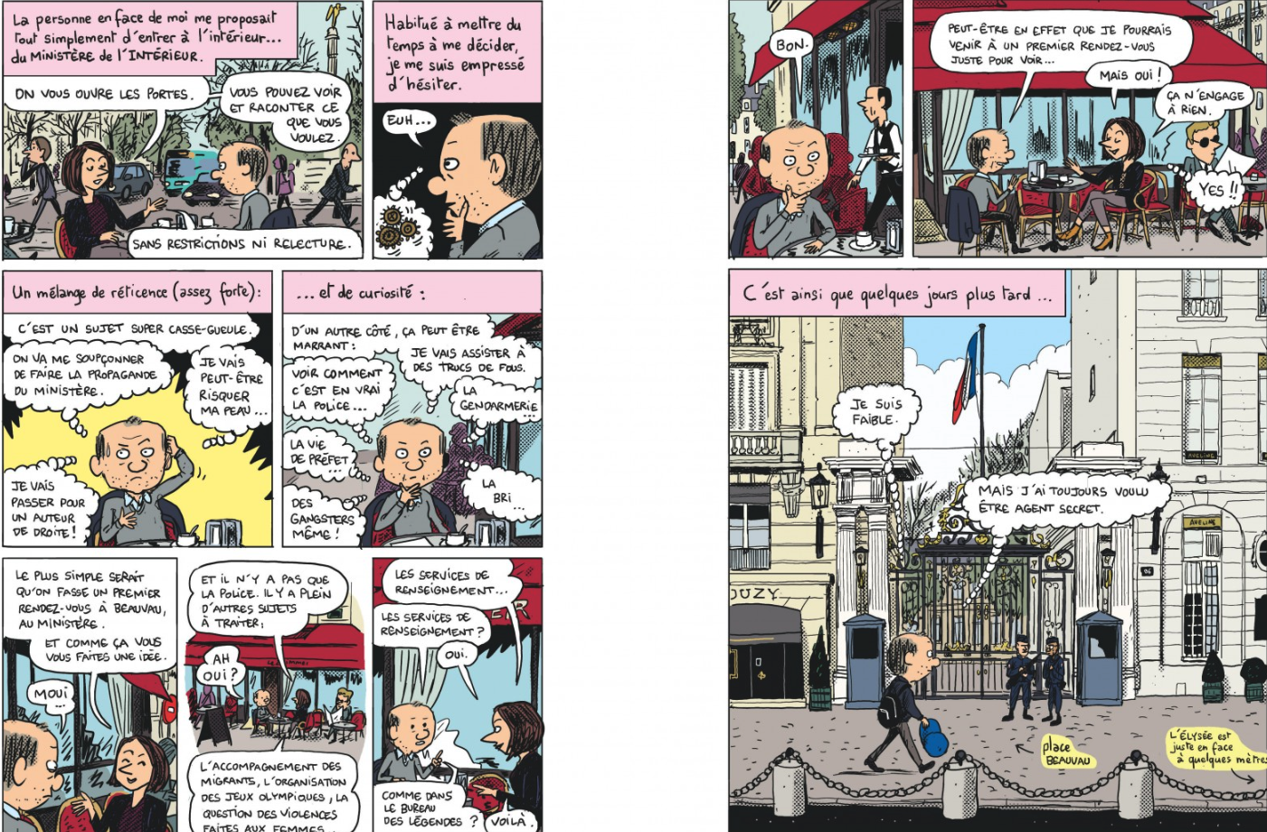 Il s’en ai fait une spécialité Mathieu Sapin des docu-reportages en immersion profonde au sein des institutions les plus méconnues de notre République, en un mot toutes. A y être. Il avait commencé pour se roder par le plateau du film Gainsbourg de Sfar, puis les coulisses de Libé ce qui n’avait dans ce cas rien de très passionnant pour le lecteur moyen non journaliste. Ensuite c’est le top avec Hollande candidat en 2012, le Chateau et les dessous de l’Elysée, une parenthèse avec Depardieu, retour à Macron de 2017 à 2019, il repart en campagne en 22 avec ses carnets, va faire un tour au Portugal et cette fois dissèque de l’intérieur les services divers et variés du ministère du même nom. On n’oubliera pas le très bel album sans aucun rapport Pas de baiser pour maman. Donc Mathieu Sapin, Rouletabille de l’info, consignateur et témoin volontaire de nos services les plus occultes a même mis pour commencer le casque et les bottes des CRS. Il a progressé rapidement dans la hiérarchie de L’Intérieur. La totale et on en apprend de belles qui sont en fait assez rassurantes.