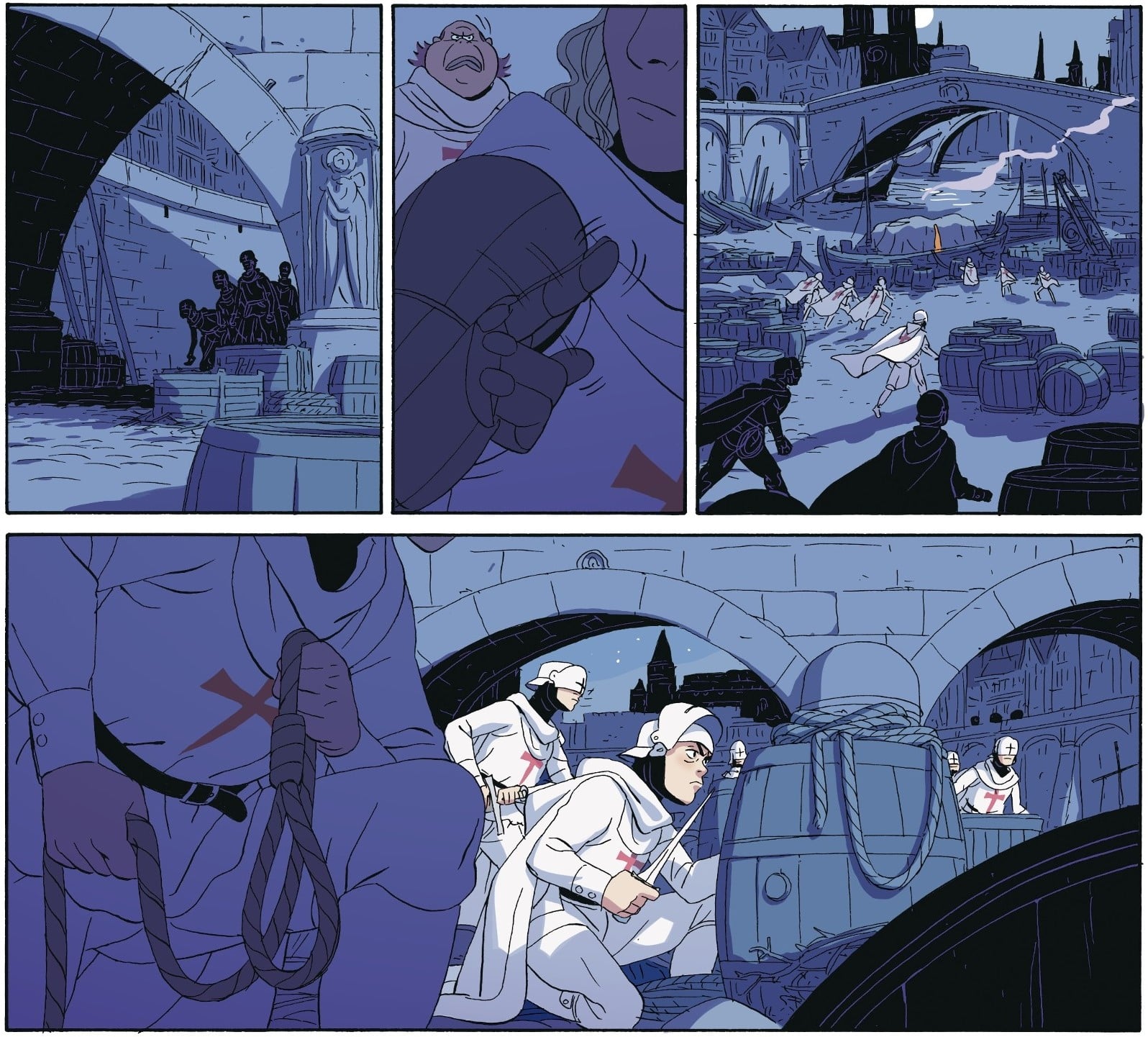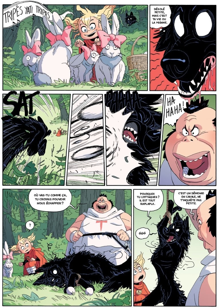 Un port, des quais, des hommes en arme qui portent la croix, les Démonios sont leurs cibles. L’Inquisition a décidé de frapper. Un homme loup se transforme mais est capturé. Il doit dire où est Ysengrin qui doit participer à la fête de Wilderman en Cocagne. Mais un autre jeune captif parle et dit qu’Ysengrin est parti accompagner un convoi de la sororité avec trois membres du clan. Le garçon est marqué au fer rouge. Un Démonio loup est rattrapé par l’Inquisition en présence d’un curieux petit chaperon rouge qui a des pouvoirs écrasants. Mais le Démonio y laisse des plumes, tombe sur des WC de campagne, passe par une cheminée, trouve un garde-manger superbe et une grand-mère endormie, redevient humain.