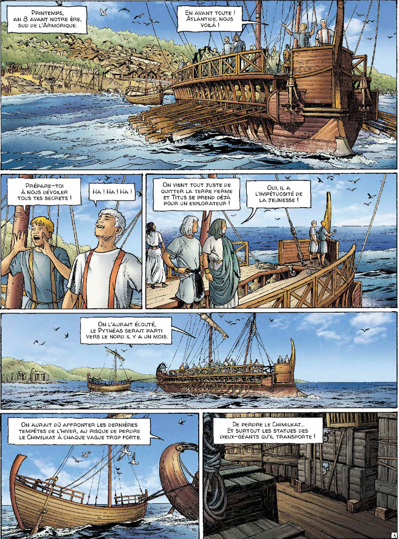 Au printemps de l’an 8 avant notre ère. Sur la galère qui traine le Chimilkat bourré de statues des dieux-géants en orichalque, pierre aux radiations mortelles, il y a des tensions comme dans le village où certains souhaitent l’échec d’Alix. Il ne faut pas ouvrir les boites de plomb qui les contiennent mais Sertis veut prier devant elles. Pause en Bretagne que regrette Nanto. Sur un site dans le style de Carnacil y a un cercle de pierre construit par les Atlantes. Les prêtres y prient pendent que Alix et ses amis pénètrent dans la forêt. Mais ils ne sont pas les bienvenus. Une volée de flèches les fait fuir. Le voyage dure des semaines mais pas d’île qui pourrait être l’Atlantide. Une attaque de baleines. Du haut d’une falaise Titus s’aperçoit que les caisses ont été ouvertes. Sertis a couru le risque d’être irradiée. Mais arrivent les glaces du Nord.