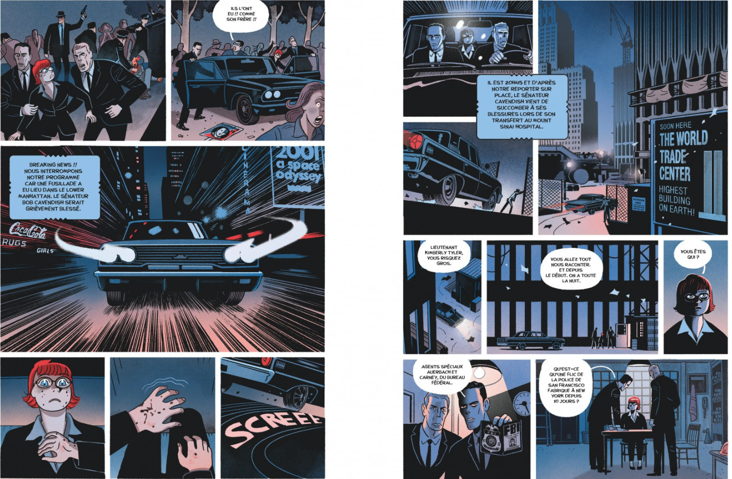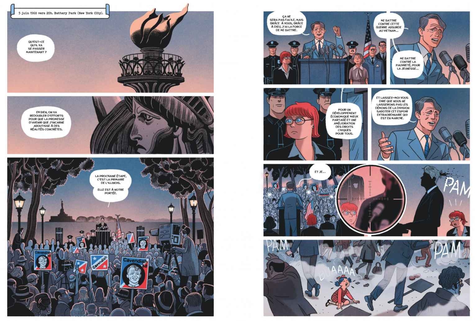C’est assez curieux mais fréquent comme démarche scénaristique, copier-coller un évènement historique sûrement méconnu par les plus jeunes et le reconditionner, identité, personnages secondaires pour en faire, cette fois, un nouvel épisode de American Parano, Manhattan Trauma tout en en conservant les grandes lignes. C’est aussi le but de la série qui revendique de s’appuyer sur les grands faits mythiques américains. Hervé Bourhis au scénario envoie Kim Tyler gérer une affaire qui va la dépasser, à savoir la protection en 1968 d’un candidat à la présidence dont le frère, lui, a été assassiné pendant son mandat. On fait court : John Kennedy en novembre 1963 à Dallas et Bob Kennedy le 5 juin 1968 à Los Angeles (peu après Luther King), marié à Eunice avec une tribu de gamins. Il y a même le patriarche Joseph Kennedy peu recommandable sur son fauteuil roulant et Jackie qui fait de la figuration. Alors qu’en penser car il y a évidemment suspense et rebondissement, ce serait sinon trop facile. Dessin toujours dans le ton de Varela et très documenté.