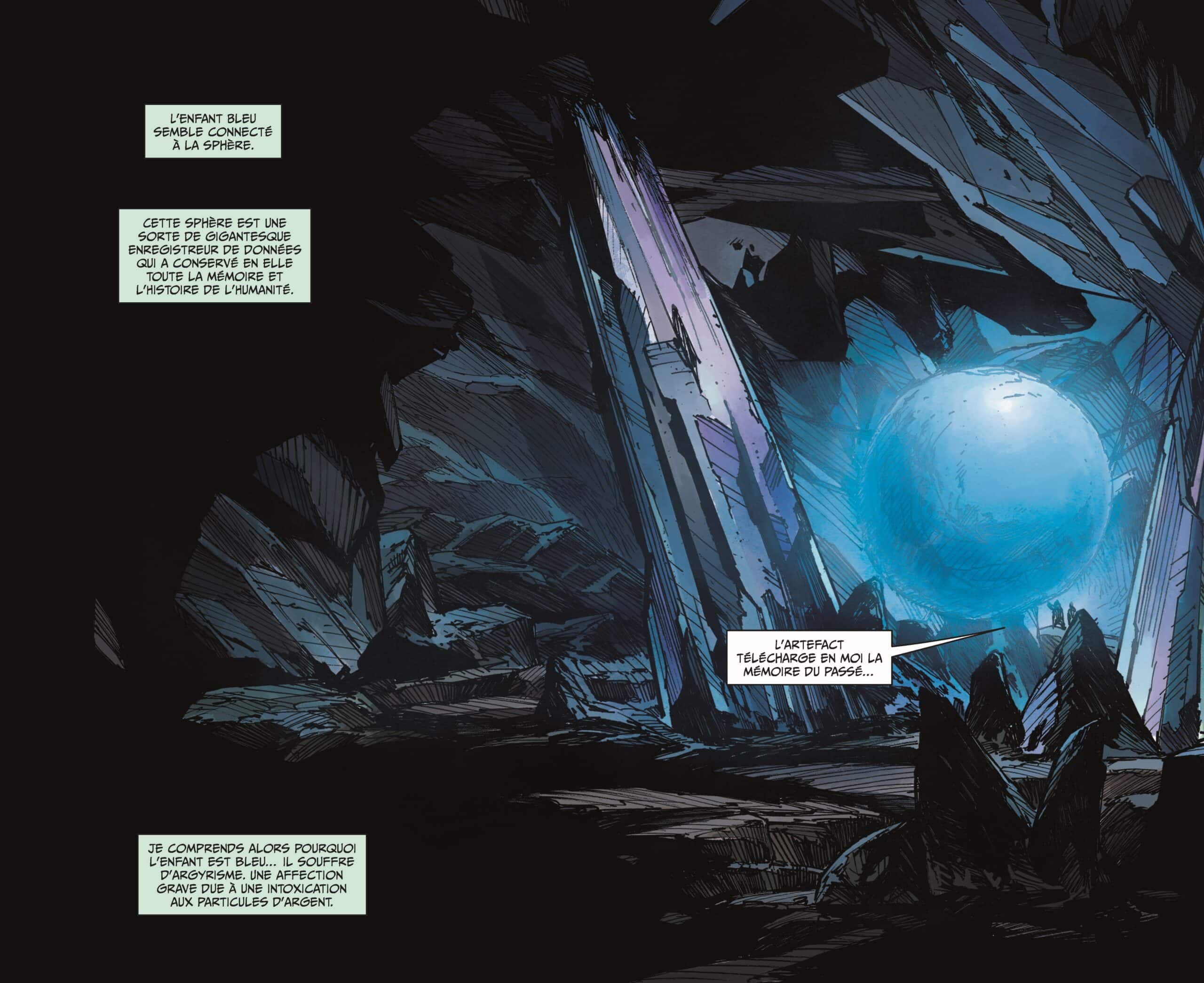 Le retour de Christophe Bec au dessin pour un album qui est à plus d’un titre hors normes. Que ce soit la conception graphique, la mise en page, le format, les panoramiques dépliables ou le fond d’une totale noirceur bien que classique, Bec se relance dans une œuvre qu’il dit avoir mis cinq ans a faire, en plus de ces autres travaux. Bec dans sa préface parle d’une démesure graphique, un style de BD qui tend à disparaître. Et la volonté de se confronter aux œuvres d’auteurs comme Druillet, Bilal, Moebius ou Caza. On en débattra si besoin au final mais est-il nécessaire de comparer ? Un mélange des genres bien scandé Inexistences, textes, une nouvelle écrite avec talent, illustrations, peintures, planches. Un enfant bleu, une guerre atomique ou plus si affinités, des survivants bien sûr qui ne savent plus où ils habitent, sans souvenirs et qui vont en chercher.