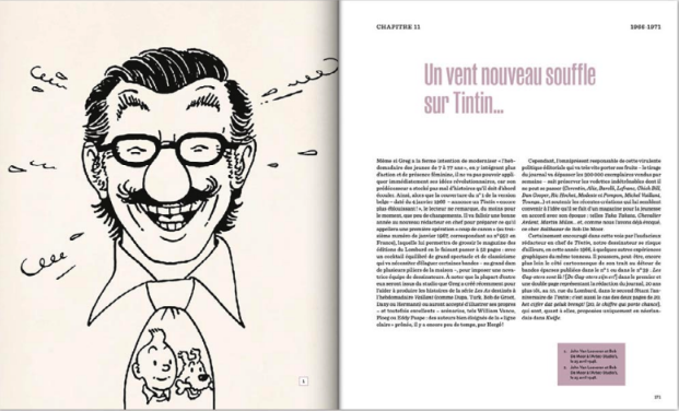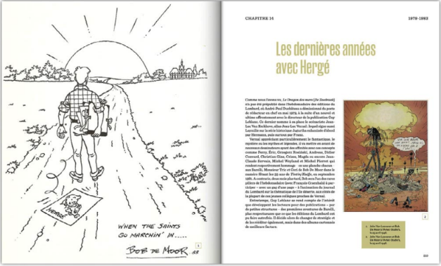 Gilles Ratier a accompli un travail de Romain qui s’ouvre sur une préface de la lignée de Bob de Moor qui rappelle en préambule quel bourreau de travail il était. Un observateur à l’oeil affuté que Gilles ratier met en première ligne, à qui il donne la narration des textes dans les pages. En 320 pages, en grand format 26,5 x 32, le bouquin propose 600 illustrations, dessins rares, planches de BD, et photos inédites. En 18 chapitres, Gilles Ratier retrace toute la vie de Bob De Moor. Passion de la voile, du dessin animé, il publie son premier dessin très guerrier dans Les Hommes au travail en 1942. Vive les zazous, des courts métrages animés, il caricature Adolph. De Moor va se former sur le tas rappelle Ratier, dessine, fait des strips. Son trait s’affine et il va passer au Lombard. On se souvient de la Révolte des gueux et passe un cap en 1950 où il travaille dans la version belge de Tintin. Et prend le chemin de la Lune. Il remaniera l’album à la demande d’Hergé en 1953 pour qui il travaille trois jours par semaine en 1951. On trouve une planche refaite dans la bio. Il va apporter sa touche aux albums de Tintin, devient présent à plein temps aux studios. On le retrouve souvent en couverture du journal. Il y aura aussi Jacques Martin, Joël-El-Azara sans oublier un de mes favoris enfant, La Vallée des cobras avec Jo, Zette et Jocko d’Hergé. L’Affaire Tournesol,, Coke en stock, Hergé le glisse en dessin dans le Sceptre d’Ottokar. Il va évoluer, chyanger de style et donner un nouveau souffle au journal.