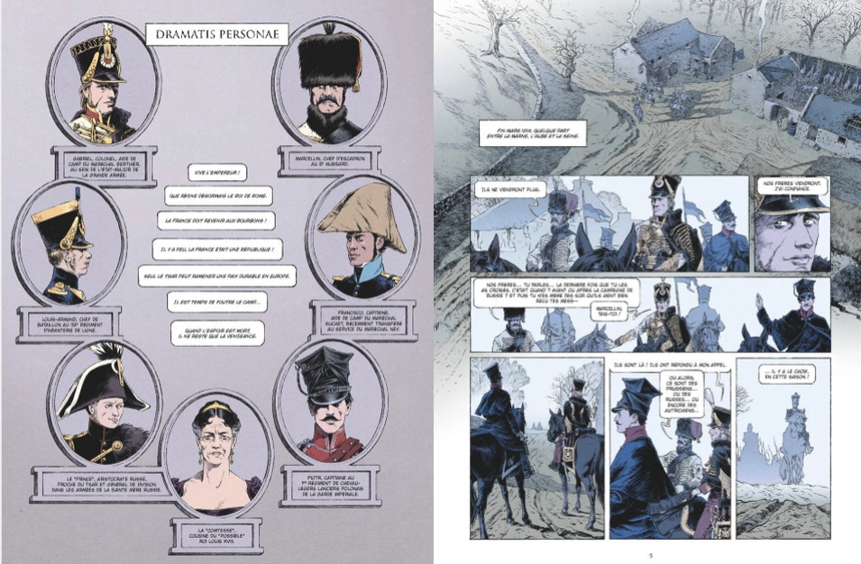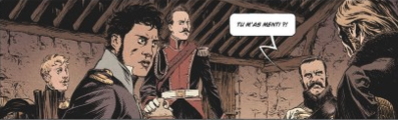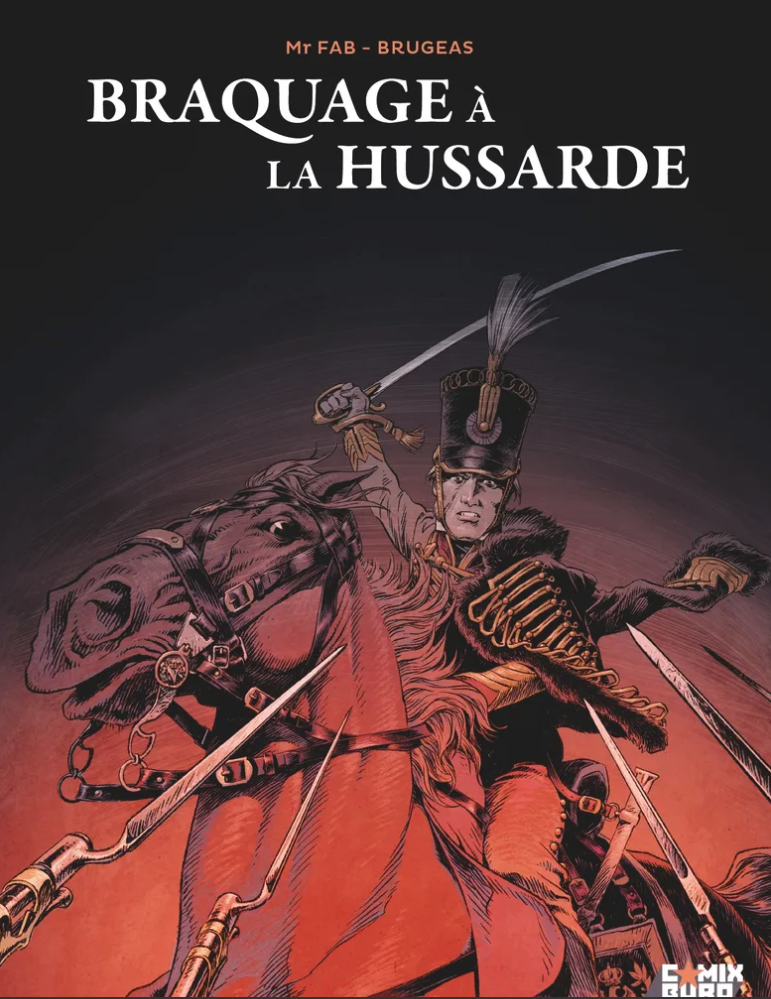 Un polar à la fin de l’Empire, au moment en 1814 où la France est encerclée de toutes parts, en dolman de hussard, bonnet en fourrure, shako, un Russe, un Polonais, et quatre autres officiers dont un prince, une princesse de sang pour une association de malfaiteurs hors normes. On a de nouveau Brugeas au scénario et Mr Fab au dessin (Colt et coal) pour un album on le dit haut et fort de très haut vol car vraiment inédit sur le fond, qui propose une mine de rebondissements et d’idées qui font de Braquage à la hussarde un Ovni en particulier par la richesse, les détails du trait travaillés, documentés. On se croirait au Musée de l’Armée ou mieux, à celui de l’Empéri à Salon-de-Provence.