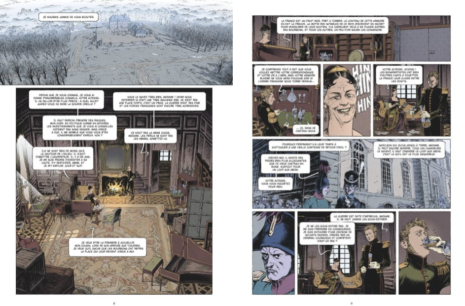 1814, tout part en vrille. Gabriel colonel, Marcellin chef d’escadron, Louis-Armand chef de bataillon, Francisco capitaine, un prince russe et Piotr capitaine de lancier polonais se retrouvent près d’une bâtisse. A priori tous sont frères maçons. Leurs troupes les accompagnent autour du château délabré où se trouve la Comtesse cousine de Louis XVIII. En compagnie du prince et d’une armoire énorme blindée qui contient or et listes de noms, de lettres de notables mouillés jusqu’au coup auprès des Bourbons. Napoléon n’a qu’un genou à terre. Le gang des cinq braqueurs tient son conseil de guerre et parlent de la lettre qui les a mis sur la piste de la comtesse qui veut mettre un réseau en place pour faire tomber plus vite Napoléon. Gabriel les a convoqués avec de faux ordres de mission. Il sait que tout est fini et il faudra désarmer les Cosaques du château qui protègent la comtesse. Elle a envoyé des messagers mais le dernier n’est pas revenu. Attaque sur le château, les canons tonnent. Le Prince s’inquiète car ses troupes sont écrasées. Il est fait prisonnier. Le commando découvre l’armoire au trésor mais seule la comtesse en connait la combinaison.