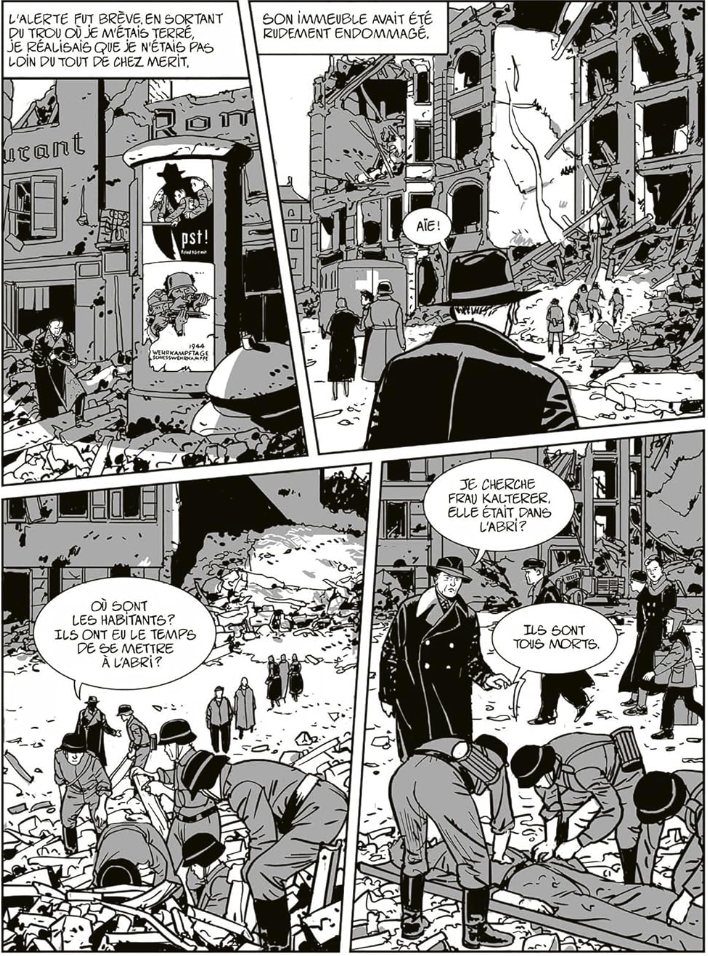 On passe de l’un à l’autre avec comme repère des têtes de chapitres numérotées de couleur différentes pour Haas et Kalterer. L’adaptation est très maîtrisée. Et c’est vrai que tous ses lecteurs n’auront pas obligatoirement lu le roman et ne pourront donc pas comparer. Kalterer et Haas sont doués et rien ne les arrête. On navigue à vue dans Berlin en ruines. Le dessin d’Alloing est encore une fois capital dans sa qualité et permet de se glisser à sa suite aux trousses des héros. Une belle palette de personnages secondaires pour une ou des vérités mortelles. A recommander. A lire aussi dans le style Columbusstrasse et Seules à Berlin de Nicolas Junker. Sans oublier l’adaptation de la Trilogie Berlinoise.