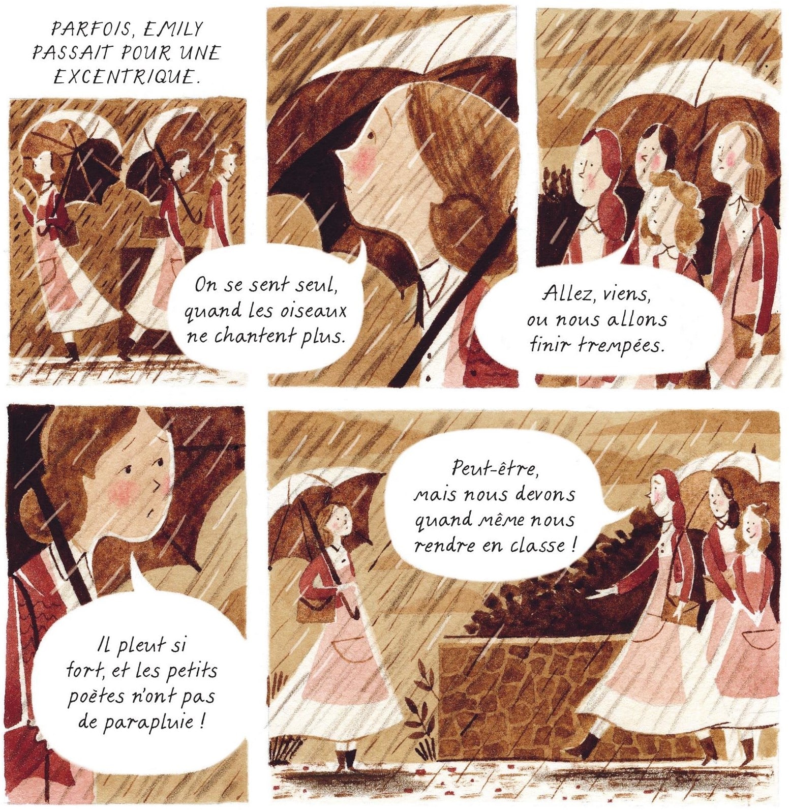 On découvre Emily Dickinson même si son nom ne nous est pas inconnue. La poésie américaine du XIXe n’est pas des plus familières à un public européen. Mais Lydia Corry réussit par la magie de son dessin, de son découpage à la rendre quasi familière. Elle parsème ses planches de ses citations, d’extraits de ses poèmes. On remarquera une double page superbe sur le bal des abeilles en hauts de forme, « ces flibustiers bourdonnants ». On suit Emily dans une aventure pleine de douceur, d’esprit. Une visite intime qui fait du bien avec Emily Dickinson (1830-1886) dont la biographie très bien cadrée conclut ce bel album.