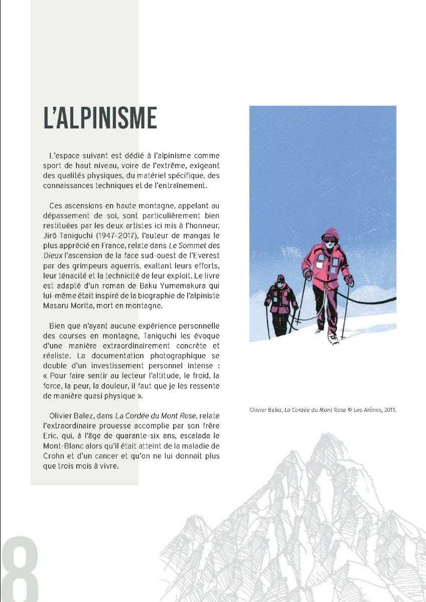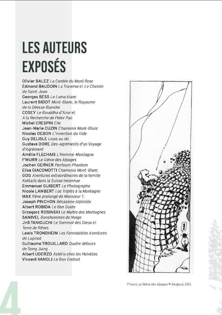 Comme le dit Thierry Groensteen, Commissaire de l’exposition et référence en matière de BD, dans sa préface : « Il y a un paradoxe à vouloir faire entrer la majesté grandiose des plus hautes montagnes dans les petites cases étriquées de la bande dessinée. Comment les artistes du neuvième art, ces miniaturistes, s’y prennent-ils pour évoquer la géographie, ses reliefs et ses abîmes ? La contrainte s’est révélée féconde, et c’est toute la magie du dessin que de réussir à nous faire ressentir l’ivresse des cimes. En réalité, la montagne n’a cessé de nourrir l’imaginaire des créateurs de bande dessinée. Bien plus qu’un simple décor, ils ont vu en elle un milieu propice à l’éclosion d’aventures humaines et spirituelles intenses.