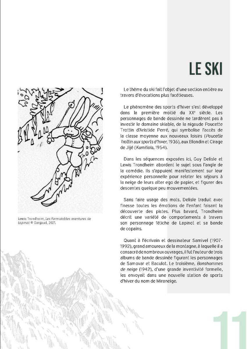 L’exposition Lignes de crête – la bande dessinée sur les sommets réunit vingt-cinq artistes de différentes nationalités. Des Alpes françaises et suisses à la Chine et au Tibet en passant par l’Afghanistan, ils nous invitent à gravir à leur suite les différentes montagnes du monde. Le voyage s’effectue selon un découpage thématique. Autour du ski, de l’alpinisme, de la rencontre avec la faune sauvage ou de l’expérience de la beauté, pour ne citer que ces quelques motifs, chaque fois une confrontation s’organise entre plusieurs ouvrages qui entrent en dialogue. Ainsi, tout en faisant découvrir des approches très différentes de la montagne et de ses sortilèges, l’exposition offre aussi un panorama de styles graphiques, de techniques narratives et d’univers d’auteurs, qui témoigne de la richesse artistique de la bande dessinée ».