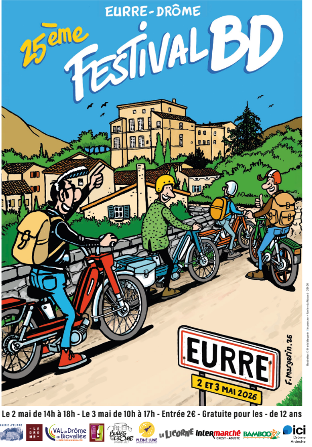 A Eurre dans la Drôme se tient le 25e Festival BD les 2 et 3 mai 2026 organisé par Bulles en Drôme. Voici les horaires. Le 2 mai de 14h à 18h et le 3 mai de 10h à 17h – Le 4 mai de 14h à 19h – Le 5 mai de 10h à 17h30 – Entrée 2€ – Gratuite pour les – de 12 ans. L’affiche est signée par Margerin.