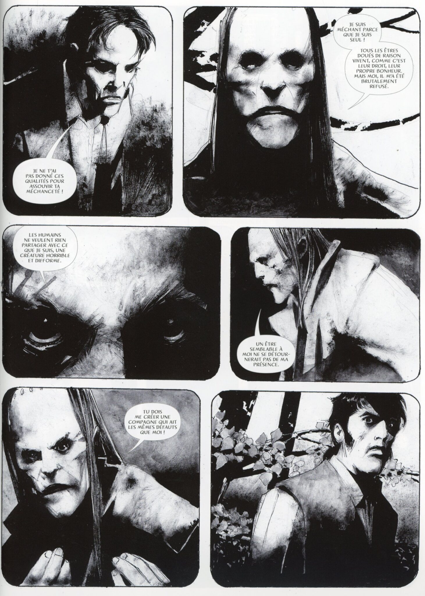 Prométhée, nom de la créature donné par la belle Elisabeth fiancée du docteur ne le laisse pas indifférent. Devant les membres de la Faculté les ennuis vont commencer. Agaçé Prométhée fait le ménage. Ce sera donc ensuite un parcours chaotique d’un monstre ou considéré comme tel en mal de sentiments. Une relation ambiguë entre le créateur, le père et le fils, la recherche de la créature en fuite, les femmes qu’ils ne peut avoir et la vengeance, cette version est très originale, prenante, superbement dessinée en noir et blanc. Le mythe est revisité avec beaucoup de talent et d’ingéniosité. Mais horrifique au maximum et en mal d’âme soeur.