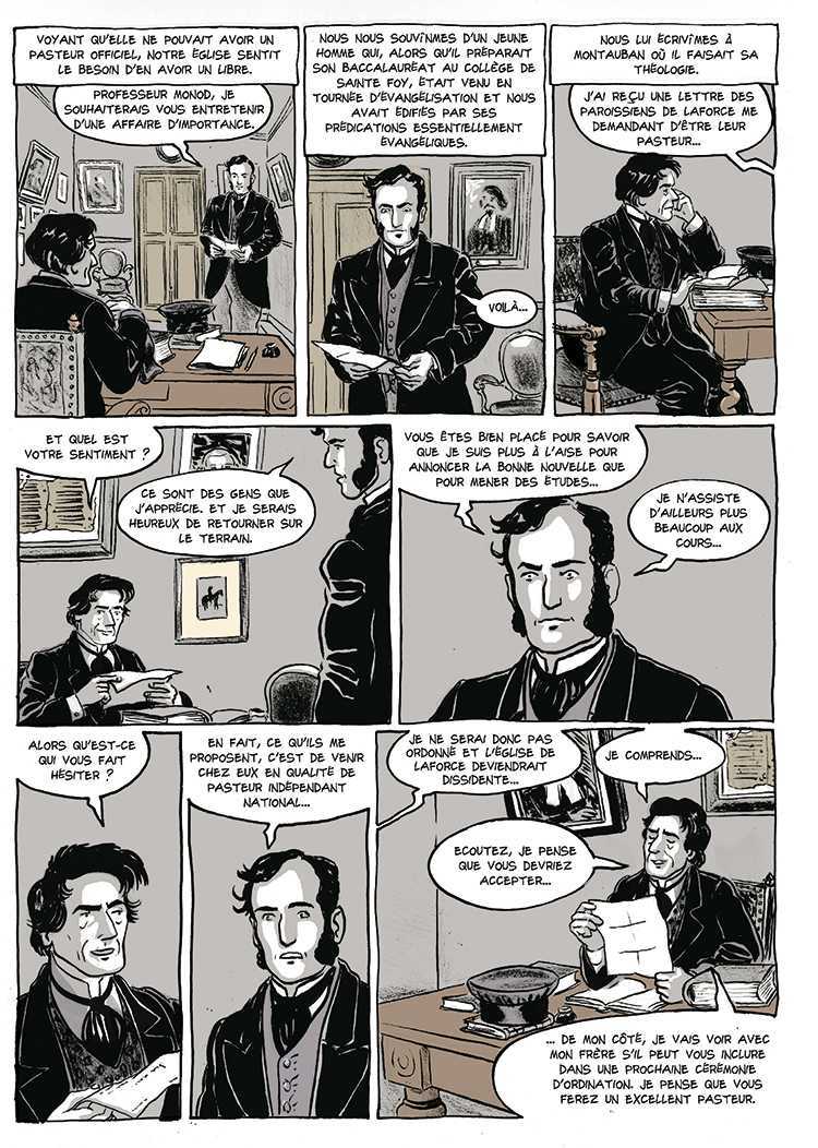 On ne peut dissocier le protestantisme de l’œuvre de Bost qui a marqué le XIXe siècle. Sa démarche repose sur sa religion et sa volonté d’en montrer la joie et l’espoir. Orphelines, malades, infirmes, Laforce était et est toujours aujourd’hui un lieu d’accueil de très nombreux patients sans préjugés en pleine Gascogne. L’internement avant Laforce était le plus souvent un lieu où l’on mourrait méprisé et abandonné. Bost n’était pas prédestiné à ce parcours hors normes. Musicien, relieur, soldat, c’est à Paris qu’il sera touché par la foi et commence son périple religieux et professionnel. Personnage complexe mais honnête envers lui-même et les autres, John Bost est respectueux de l’ordre établi mais un visionnaire que rien ne va arrêter. En suivant Bost dans cet album au trait clair, aux textes concis, on découvre un homme dont la devise « je ne regarde pas ce que j’ai fait mais ce que j’ai à faire » résume la vie.