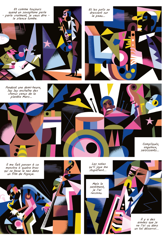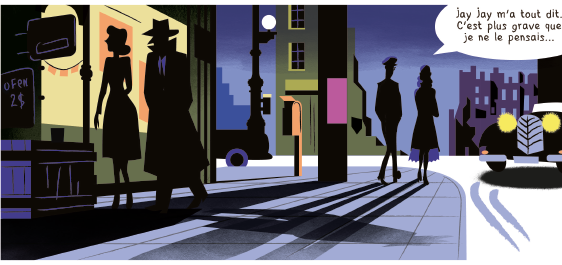 On a travaillé pour la doc sur des films que Thierry Smolderen avait retrouvés, d’après-guerre. C’est moi qui avais inventé le héros, Norman Bold, dans un autre album, Disparitions au Jazz Club. Je l’avais un peu oublié. Il y a quelques années je me suis amusé à le redessiner. J’en ai parlé avec Thierry, fan de jazz qui avait des trames en tête, des nuages comme il dit. Il les recolle entre elles et crée une histoire. Là il avait plusieurs parties qu’il ne savait pas comment assembler et quand je lui ai parlé de reprendre ce personnage il a été partant. Ses idées des fois se rejoignent et il avait deux histoires qui se sont bien collées ensemble.