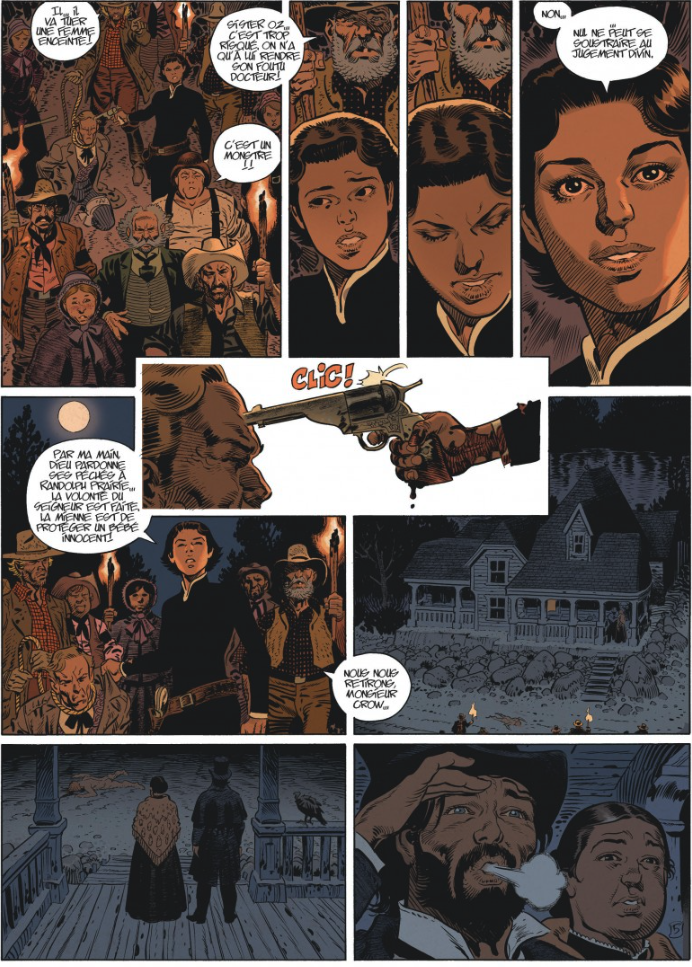 Oui je suis un bon client. Je suis un fan des anciens comme L’Homme qui a tué Liberty Valance, Rio Bravo puis les Eastwood. Deadwood la série. Mais cela n’influence pas vraiment mon travail. Il y a les peintres US de l’époque pour la documentation. De bonnes sources pour les lumières. Mais l’écriture BD est spécifique toutefois.