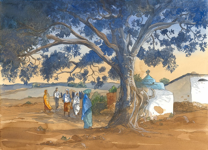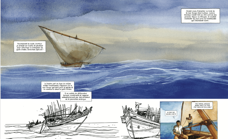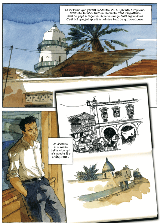 Pour Alessandra, politique et guerre obligent au Yemen, ce sera Djibouti qu’il connait bien mais en bateau, sur un boutre à la Monfreid. Une saison en enfer, la quête se poursuit aux côtés d’Alessandra. Le train du Négus, une succession d’aquarelles en forme de prises de vue, d’images saisies sur le vif, qui enchaînent les étapes. Voix off de l’auteur, que le suspense demeure. La belle Mariam pour amoureuse mais l’appel de Rimbaud est le plus fort. Imagination, réalité, quelle frontière. Alessandra le rêveur d’horizons signe là un album envoûtant, splendide comme il sait si bien les faire. Les paysages s’y prêtent, Rimbaud aussi. Alors un dernier poème pour sa Mariam ?