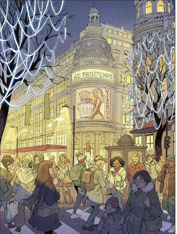 Un Noël à Paris est dessiné par Giuseppe Liotti d’un trait chaleureux et savoureux. Jim assure le scénario. L’auteur entre autres d’Une Nuit à Rome sait gérer à merveille les ambiances de couple en péril cette fois en pleine réjouissances festives. Paris dans un bar une jeune femme rencontre un garçon sympa et ils échangent gentiment sauf que c’est un couple qui tente une manoeuvre de la dernière chance avant d’exploser en vol. Vingt ans de vie commune, le boulot d’abord, une vie de cons et on va annoncer la séparation aux gosses après les Fêtes car en prime on passe Noël chez les parents d’Eve, c’est elle, et lui c’est Simon. Faudra récupérer les enfants, Bertrand collègue d’Eve se pointe et part avec elle. Elle dit que tout va bien. Les cadeaux et les vitrines des grands magasins parisiens. Réveil matinal pour Simon par son fils Etienne qui doit aller chez l’ophtalmo. Strabisme divergent. Coup de fil de la soeur de Simon pour rappeler son anniversaire, sa réception qui se télescope avec le diner de Noël. Eve est décoratrice et met en scène les vitrines mais le soir c’est Noël. Simon a des enfants turbulents. Son fils Ulysse l’appelle gros et il amène Etienne chez le médecin. Une rééducation s’impose où c’est l’opération. Eve a sa mère que cela ennuie de faire des cadeaux. Elle lui laisse la CB de son père et luit dit qu’elle peut y aller. Vie de dingues mais on est tous à peu près dans la lignée de ces personnages qu’une fois encore Jim sait à merveille faire vivre. Va y avoir de l’eau dans le gaz, des rebondissement mais la magie de Noël peut-être ? Un miracle c’est de circonstance. A suivre. Un Noël à Paris, 1/2, 104 pages, 20,45 €
