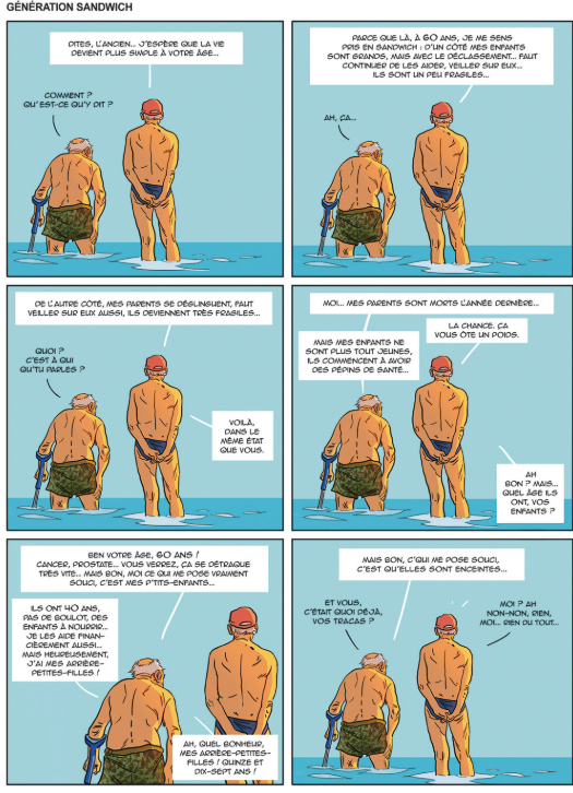 Deux albums donc pour Jim, le premier comme dessinateur-scénariste, 60 ans déjà ? aux éditions Anspach et le second Un Noël à Paris comme scénariste avec Giuseppe Liotti au dessin publié au Lombard. Avec 60 ans déjà ? le point d’interrogation marque à dessein l’effet de surprise. On a beau s’y attendre, on est pris au piège. Jim a une jolie formule en ouverture de son album : prêt à affronter la jeunesse de la vieillesse ? Alors comme il a de l’humour, une vraie sensibilité il se livre et on se dit qu’il y a du vécu dans ses planches gags. D’accord il flirte avec la soixantaine bienveillante et aura donc sous peu le tarif SNCF senior, une dame enceinte qui lui proposera sa place dans le métro (bon, c’est vrai je suis plus vieux que Jim), les petits enfants à demeure à Toussaint, Noël et pire que tout deux mois aux grandes vacances (là aussi on a donné). Il dit aussi Jim que cela a du bon 60 ans, picoler, moto, fumette, on en passe. Il y aussi les cougars matures mais qui ont l’oeil sur la chair fraiche sans complexe. 60 ans seraient le nouveau 40 avec espérance de vie un brin en hausse mais attention au stress des seniors et les accidents du travail. Des cases fixes qui évoluent dans la dernière dont les dialogues sont ciselés, très bien vus. On a adoré la petite fille qui fait un château de sable avec son grand-père. De quoi faire gaffe, promis. Et vous avez déjà eu la question qui tue : dis Panou, tu est vieux alors tu vas mourir non ? Si j’avais dit ça au mien de Panou j’aurais pris une baffe. Un soupçon de cruauté bien sentie, un bonheur car Jim explore tous les champs du possible des sexagénaires. 60 ans déjà ? 56 pages, Anspach, 15,50 €