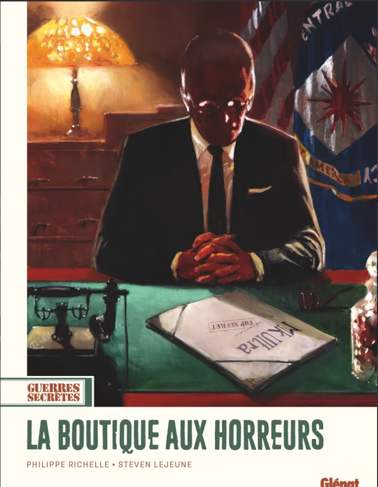 Dans la collection Guerres secrètes, on passe dans le domaine peu connu de la soumission chimique, manipulation à l’aide de drogues de patients divers dans le cadre d’une vaste opération mise en place par la CIA. Lavage de cerveau, et élimination des témoins, un docteur Folamour doublé de Docteur No, dans La Boutique aux horreurs, titre copié sur celui du film sans le mot petite, on va découvrir que rien ne peut arrêter la volonté d’un pays à aller vers le pire. Ni plus ni moins dans le style que ce qu’on fait les Allemands en expérimentations inhumaines pendant la guerre. Sauf que là on est aux USA au début des années 50 avec un agent de la CIA qui va vite comprendre qu’il vit un cauchemar. Philippe Richelle a lancé comme le dit Glénat une nouvelle série-concept consacrée à l’émergence des services secrets au XXe siècle. Chaque tome explore une opération menée dans l’ombre, le plus souvent au cœur conflits majeurs : Seconde Guerre mondiale, Guerre froide, après-Guerre froide ou encore conflit israélo-arabe. Avec un réalisme saisissant, cette série de polars historiques, tous auto-conclusifs, dévoile des récits passionnants et met en lumière des personnages hors normes, prêts à tout, souvent au mépris des règles. Au dessin pour la Boutique, Steven Lejeune qui assure bien la vision du contexte.
