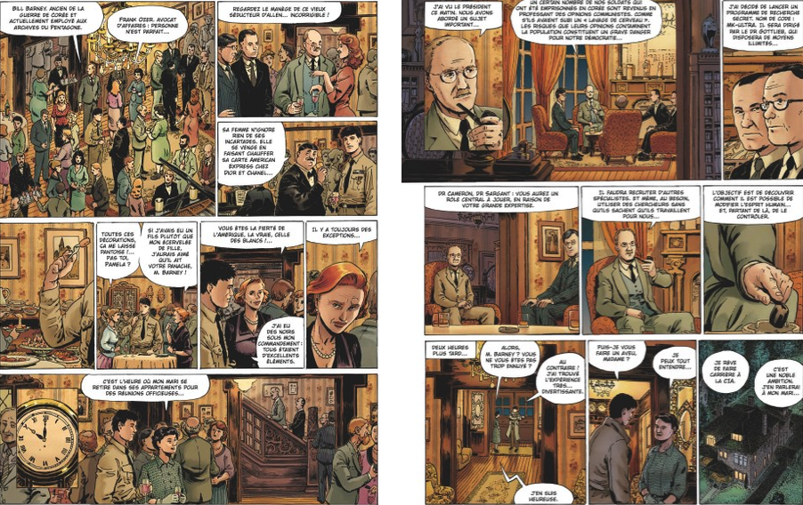 Une certaine outrance dans le visuel des méchants docteurs pour bien marquer le côté horrible de ce qu’ils font. Barney va enquêter, le tout est inspiré de faits et de personnages réels. Barney est inspiré de l’agent Buckley qui était au service de Gottlieb. La CIA état dans l’état dans les années 70, du Vietnam au Guatemala, au Watergate ira loin, trop loin et la Presse américaine va mettre au jour ses actions illégales. Cet album est un exemple qui peut faire craindre que dans ce que vit l’Amérique au plus au niveau aujourd’hui des dérives du même gente puissent être possibles. Il faudrait un agent Buckley.