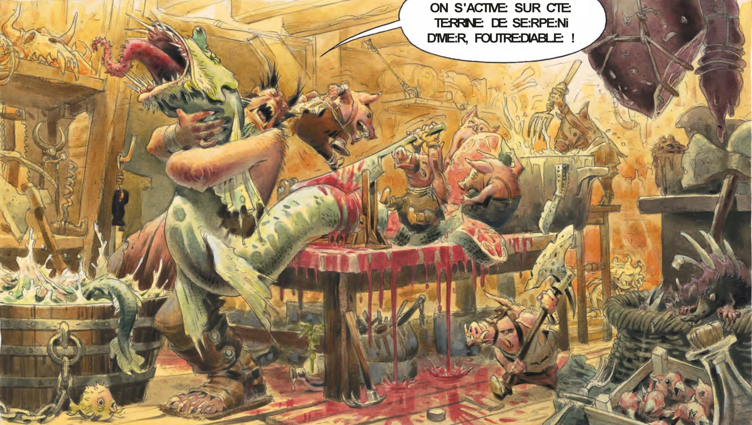 Il y a du monde et de tous les milieux dans le sac. Puis ce sera la prison sur la place du grand marché des ogres. Tout ne fait que commencer. Qui va emporter le gibier ? Blanchette sera-t-elle transformée en farce à boudin ? Ambiances, décors, dialogues, c’est du grand art que Jean-Baptiste Andréae a mis en images avec un talent incontournable. Fabien a dû bien s’amuser. On a un petit côté farce, pas à boudin, mais grand-guignolesque. Ils ne sont pas tristes ces ogres, Grangousier compris (relisez Gargantua), et le banquet, ogresse en prime, vaut le détour. On se régale, vous en reprendrez bien un petit peu, beaucoup ? Assurément et Blanchette est une héroïne qui ne manque pas de nerfs et n’est pas sortie de l’auberge. On n’en dit pas plus. Un des meilleurs titres du moment.
