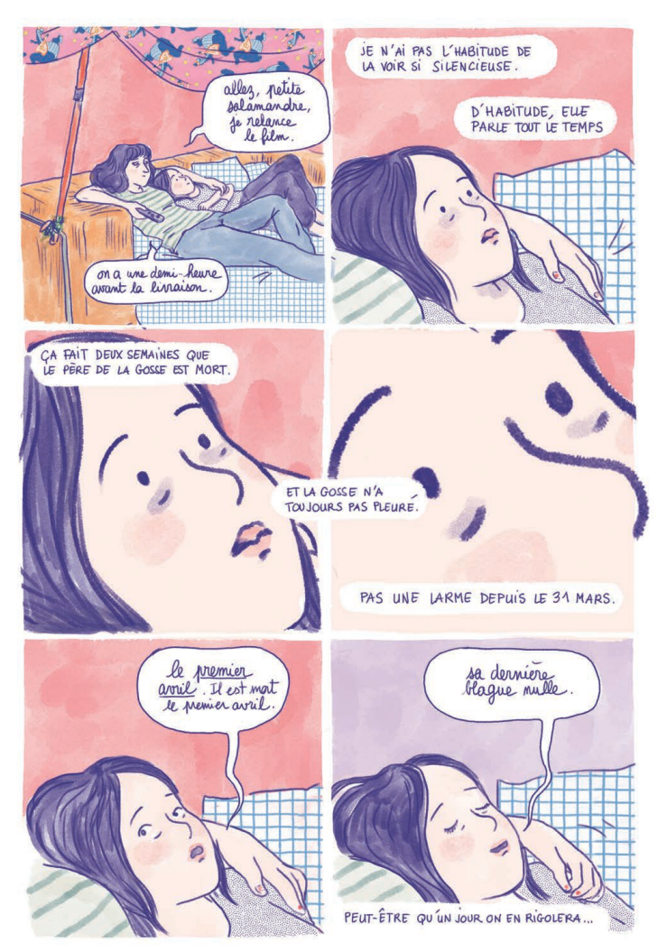 Un deuil sous une tente improvisée au dessus du canapé du salon, deux semaines que le père de la gosse, surnom d’origine maternelle, est mort. Cela dit les ponts étaient rompus pour cause diverses dont l’alcool et un amour perdu. On commandes des nachos et la maman croule sous le messages de condoléances. La gosse qui a 11 ans se tait. Son père est mort le 1er avril, son dernier pied de nez. Une balade en bateau avec la copine Loulou et le lendemain la mère doit retourner au boulot. La tente ne bouge pas et on parle beauté des enfants. La gosse a été un beau bébé et est jolie ado, regard suspicieux sur le maquillage, les fringues, baby doll. Jeune la maman était intériorisée et avait validé le concept de la femme-enfant. Flash-back sur sa propre adolescente, pièce de théâtre où pas doué et un peu enveloppé elle sera une fée bucheron. Alors que fée Clochette c’est le rêve. Une maman écrivain, qui est bloquée devant sa fille aspirée par un escalator dans lequel s’est pris son écharpe. mauvaise mère mais surtout qui ne sert à rien. Petit c’est facile un gamin. Quand les années passent tout se complique. Adolescence tourmentée. Et impuissance totale. Comment elle est arrivée au monde la gosse ? Un verre de trop et un géniteur imbibé, une mère solitaire, pas des débuts parfaits mais bon on ne choisit pas.