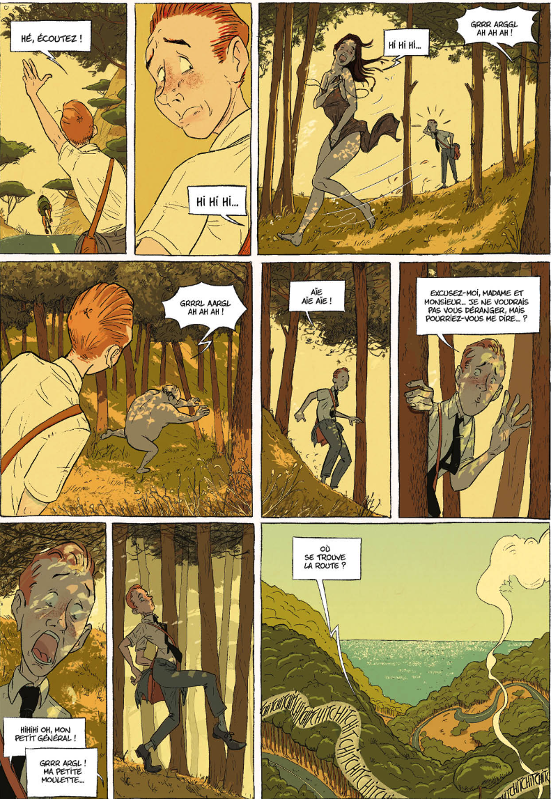 Un sujet qui a une belle consistante aussi bien en dessin qu’en histoire, La Nouvelle Arcadie c’est finalement une de ces opérations immobilières qui ont transformé un petit village du Sud au bord d’une calanque en barres d’immeubles pour touristes venus du Nord. Il y en a eu et non des moindres comme au Cap d’Agde dans les années 70 ou plus tôt en Espagne. Mais voilà, à la même époque à Chagrin-sur-Mer il va y avoir de la résistance et pas que passive. Le jeune agent immobilier venu tout préparer tombe sur un drôle de famille, les Nomdedieu propriétaires des terrains et mal aimés du coin. Juanjo Rodriguez J. est à la manoeuvre avec beaucoup de talent, en finesse, humour et constate que parfois les petits peuvent s’opposer aux grands, avec un idéal victorieux. Joyeusement satirique. Et le dessin de Rodriguez qui a bien évolué depuis La Dynamique des franges.