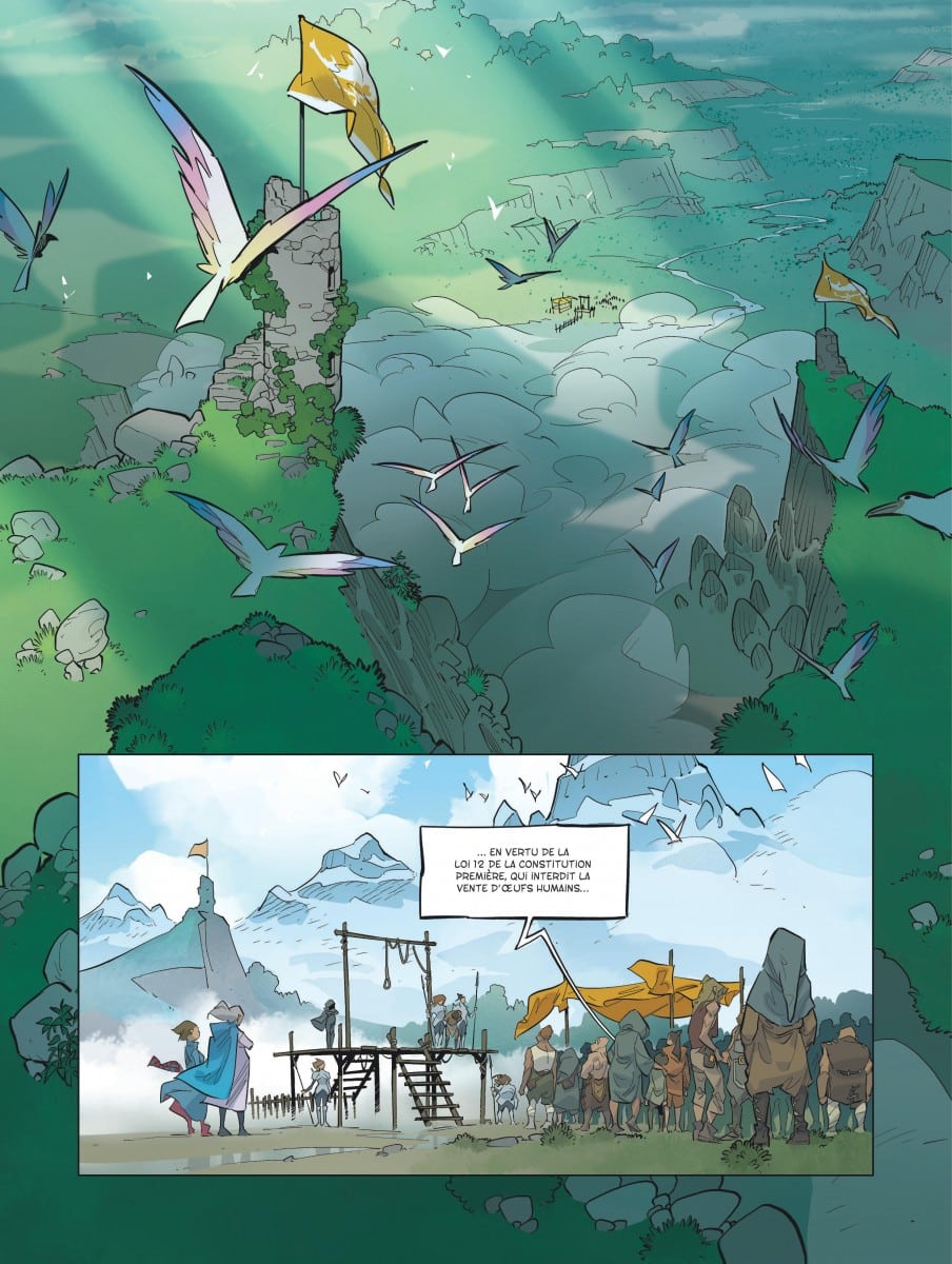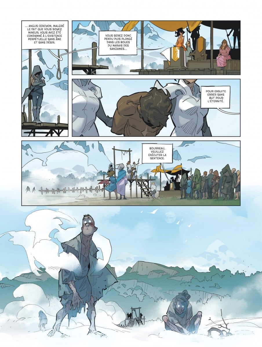 On pend un jeune garçon Angus qui a vendu un œuf humain. Il est condamné à errer sans âme et sans désir. Dans cette société les femmes ovipares sont les reines, les hommes des esclaves. Angus est jeté dans un lac brumeux devenu un sanzame. Les femmes sont en paix avec les loups mais leur donnent deux œufs d’enfants en pâture chaque mois pour prix de la paix. Un œuf male pour que le loup se fixe en garçon, fille pour le contraire car sinon le loup ne cesse de changer de sexe. Comme Petigré qui bien que promis au trône veut devenir louve. Et refuse l’œuf humain masculin. Rum est un humain amoureux de Petigré et se moque de son sexe. Mais il y a un prétendant dangereux Kourgane au royaume des loups qui manigance pour prendre le pouvoir. Rum est un combattant hors pair mais ne sera jamais un loup.