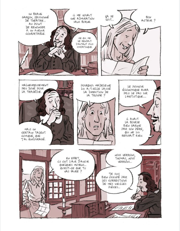 Doc dès le début Molière abat ses carte. Il aurait pensé se rapprocher du grand Corneille en 1658 alors que le Prince de Conti lui a conseillé d’aller voir ailleurs si il y était. Molière aimerait bien qu’il lui écrive une pièce, une sorte de deal. Il lui envoi une lettre. Molière et sa troupe revient à Rouen. Il y a Madeleine Béjart dont se souvient bien Pierre Corneille et de Poquelin dit Molière pas doué pour le drame plus pour la comédie. Qui dirige désormais la troupe. Pour Corneille rien ne presse. Armande fait la tête. Catherine et Marquise sont à Lyon. A Rouen Corneille corrige les éditions de ses oeuvres, en famille. Dans la rue passe la troupe qui déclame Le Cid avec Molière à sa tête. Ils vont jouer dans les tavernes où on se bagarre. Molière en profite pour livrer les tapisseries de son père. On imprime une affichette pour annoncer la représentation et Corneille arrive. Molière demande à Madeleine de se renseigner sur les salons fréquentés par Corneille. On y parle de tout et de théâtre bien sûr et Madeleine le rencontre. Oui il a bien reçu la lettre de Molière.