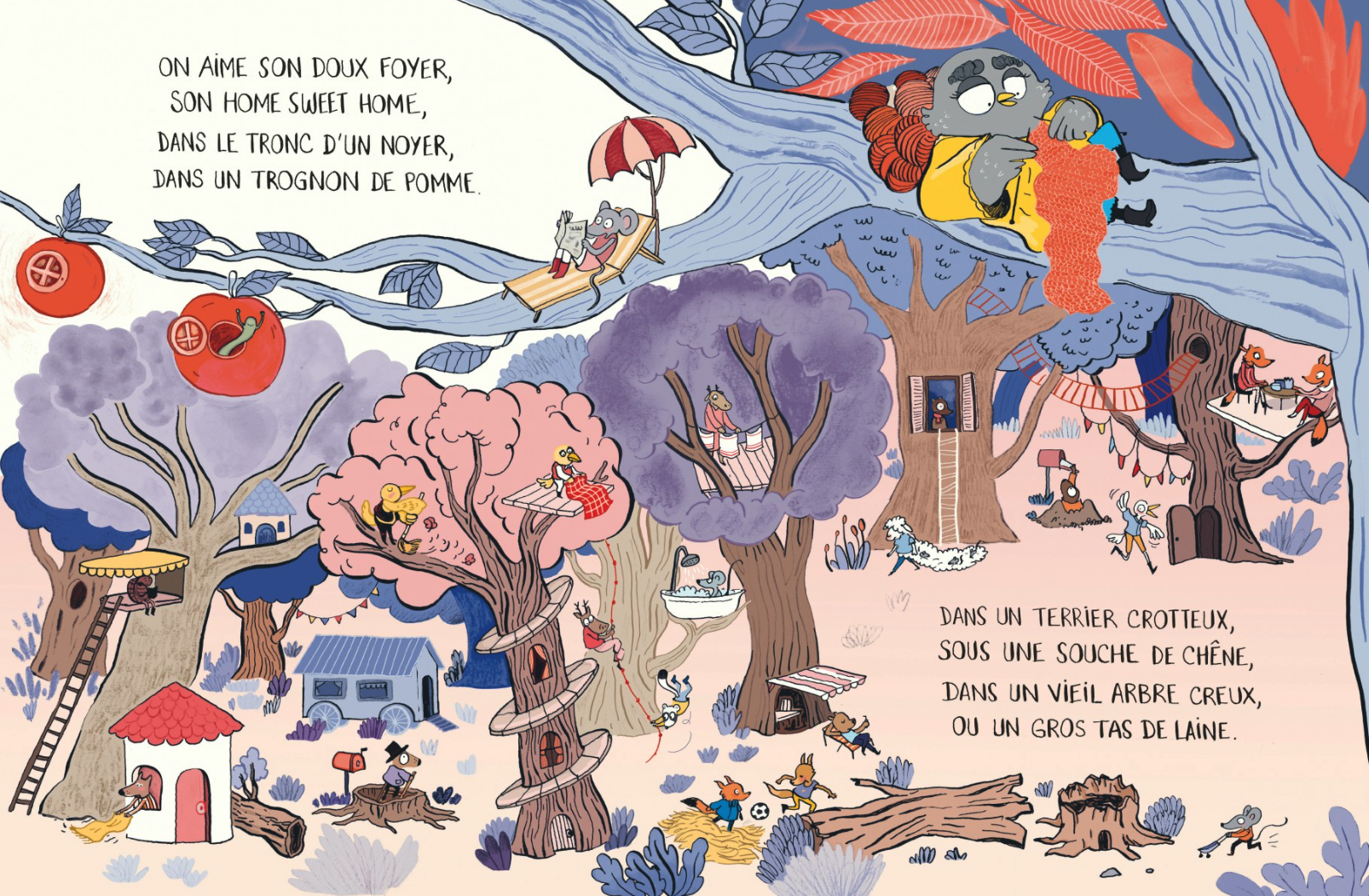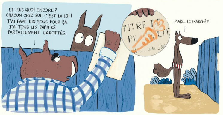 Tout va bien dans la forêt. Home sweet home comme chacun veux et où il veut. Quand tape à la porte du loup un notaire forestier, Maître de Garenne. Il mesure les terrains, note les maisons et distribue de titres de propriété. Tout doit être en règle, une première. Et il faut payer. Désormais on ne peut plus passer sur le terrain des autres. Ni se baigner dans la mare sans payer aussi. La forêt est devenu le parcours du combattant avec même des sens interdit. Robert, un écureuil a tout compris et a racheté tous les titres au notaire. Il est maintenant le seul propriétaire et a une police pour les mécontents. Le matin le loup découvre une pancarte, respirer coûte cher donc il faut un respirator 200 (payant bien sûr) pour respirer moins. L’écureuil est encore à la manoeuvre. Pour respirer il faut s’abonner mais il est généreux. La nuit l’air est gratuit. Tous ont une sorte de masque à gaz sur le nez et les vers de terre sont expulsés pour cause de parasitage des lopins. Ce n’est pas fini car le loup en slip va s’en mêler.