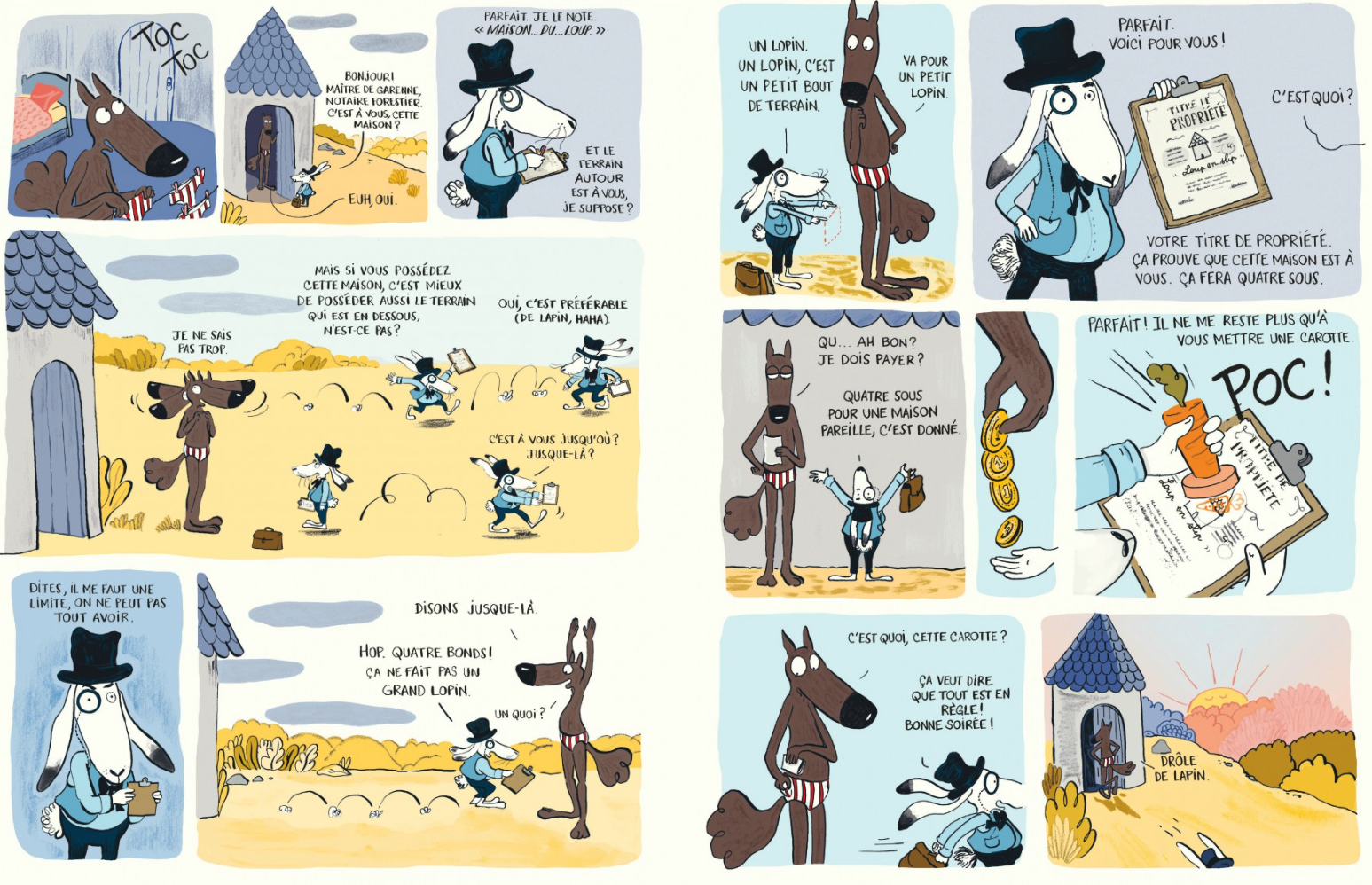 Un promoteur immobilier un brin escroc, la loi du notaire au service de l’argent, la satire est bien vue, drôle mais finalement interroge. La mentalité change avec cette logique capitalistique dénoncée par Lupano. Avec simplicité pour que cela puisse être compris par le public jeunesse. Deux pages en final pour se rapprocher des Vieux Fourneaux ou le trio des Papés t’inquiète pour ses titres de propriété. Un joli clin d’oeil et un album qui une fois de plus fait mouche. Le loup en slip sait rebattre les cartes avec humour et devenir le champion de la liberté individuelle.
