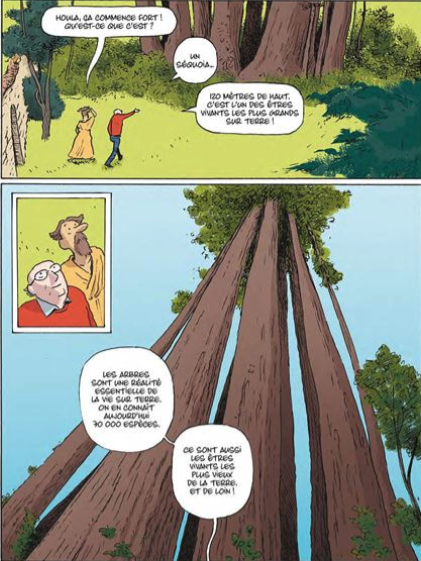 Comme le précise Yves Frémion, Francis Hallé, botaniste internationalement connu, nous a quittés récemment. Avec le scénariste Vincent Zabus (écrivain, scénariste jeunesse et dramaturge belge), il nous emmène dans une promenade en forêt à la découverte de l’univers des arbres. Nous voilà aussi bien dans la forêt équatoriale que dans notre propre jardin ou celui d’un voisin. Nicoby anime leur histoire déambulation de sa plume efficace. Le style est réaliste avec une pointe plus humoristique, Nicoby pouvant passer de l’un à l’autre. Son œuvre est en effet très éclectique et souvent en coopération avec des autrices et auteurs extérieurs à la BD. Vincent Zabus comme Nicoby a travaillé à Spirou et adapté ‘’Le monde de Sophie’’. L’album avait bénéficié des couleurs de Philippe Ory, disparu prématurément l’an dernier. Pierre Janneau a réussi l’exploit de terminer les couleurs sans qu’un heurt de style se remarque. Au total une parfaite réussite qui allie une discrète mais ferme pédagogie a une véritable histoire bien narrée et parfois amusante.