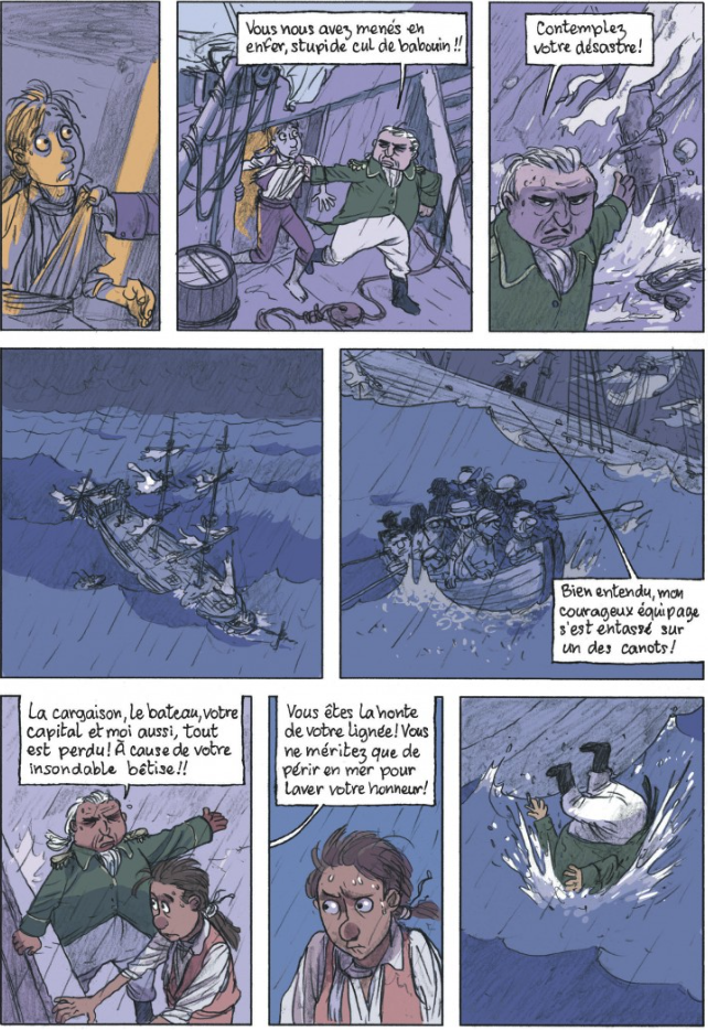 Un titre qui a sa part d’humour car dans le langage courant les Grandes Personnes ce sont les adultes opposées aux enfants qui leur doivent respect. On n’est pas loin de cette vision dans cet album singulier de Tehem à qui l’on doit Vingt-décembre avec Appollo. Singulier aussi par sa narration surprenante, subtile et qui peut amener à se poser des questions nécessaires sur où on en est exactement. Chaque personnage se raconte devenant acteur puis témoin des autres ce qui oblige à raccorder parfois les wagons. Cela dit Les Grandes Personnes ont le charme et l’efficacité des œuvres qui sortent des sentiers battus. Un naufrage qui va de Robinson Crusoé à surtout aux Voyages de Gulliver que ce soit sur le fond, la forme et la ligne philosophique.