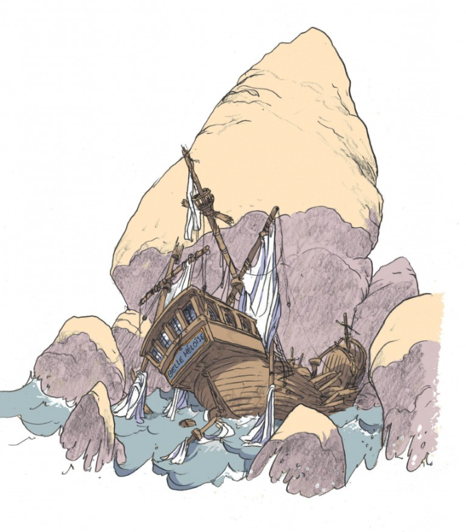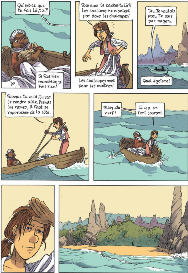 Un navire chargé d’esclaves qui fait naufrage, la Belle Héloïse. Un survivant imbu de lui-même, prétentieux, méprisant, autoritaire, Emilien et Prudence une brave femme douée en plantes médicinales. Si le vaisseau s’est échoué c’est la faute d’Emilien qui a forcé le capitaine à appareiller. Tempête, chaloupe où se glisse Emilien seul survivant avec Prudence qu’il y découvre elle-aussi cachée. Un esclave n’a pas le droit de sauver sa vie ainsi mais à y être le duo fouille la jungle bourrée d’insectes venimeux, de fruits et d’animaux bizarres. Emilien attache Prudence de peur qu’elle s’enfuit. Ce qu’elle fait. Emilien dans une rivière est capturé par une géante qui lui met une laisse et le ramène au village. Commence alors pour lui une vie d’esclave comme celle qu’il avait imposé aux siens. Evasion manquée, travaux épuisants car un lilliputien par rapport aux grandes personnes, on l’enferme dans une jarre pour la nuit. Un inconnu lui a lancé des bouts de bois attachés. Mais hormis les géantes il y a aussi des anthropophages et de drôles de plantes blanches style champignons pas très comestibles mais peut-être pratiques. Prudence est la plus douée, va soigner les géantes et sauver une de leurs filles.