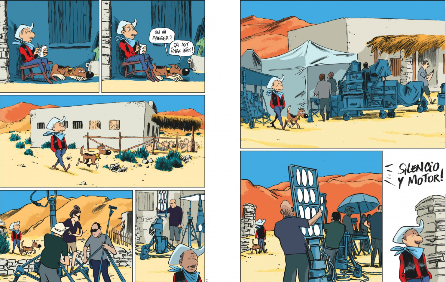 Il est sur le terrai Bouzard, en costume de cow-boy avec Rantanplan à ses pieds. Il fait un reportage dessiné sur le tournage de la série. Equipes de prises de vue, silencio car on est en Espagne, il promène Bouzard en Stetson. Les Dalton dans le coin et un flash back sur le pourquoi de cette balada ibérique. Il s’est équipé Bouzard avec difficultés. Un selle texane mitée, des fringues à la John Wayne, fait un stage de vache, apprend à cracher, pendre un pied-tendre, se battre. La totale. Direction Alméria où se sont tournés tous les westerns spaghettis. Rencontre avec le staff et Bouzard prêt à donner un coup de main dans tout pour tout. A cheval puis en bagnole avec digressions incongrues. Le désert où toutes les stars ont tourné. Il doit être discret dixit la productrice. Quant à jouer dans le film il a vu la Vierge. Il peut peut-être arroser les palmiers, une obsession. Rantanplan ne fait pas partie du casting. Mais il parle. Des chèvres et déjeuner avec Alban Lenoir qui joue Luke et Benjamin Rocher le réalisateur. Et Averell, Jérôme Niel qui joue Joe Dalton. Petits boulots mais il est nul. Reste plus que l’IA., jolies gravures alors finalement, Bouzard dans tout ça ?