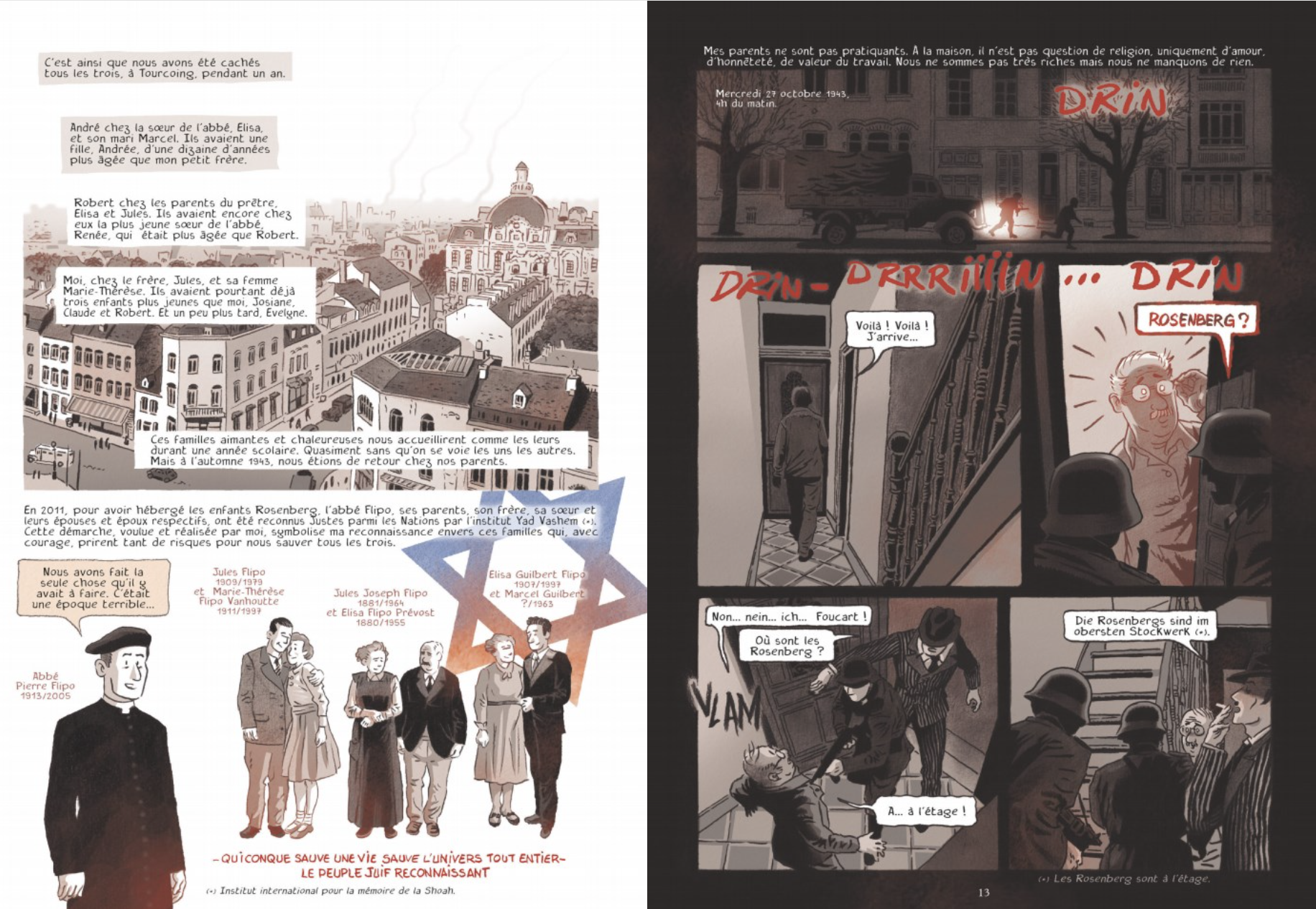 2015, une vieille dame est convoqué à la police pour récupérer une pochette perdue. Le policier est dans un premier temps odieux et soudai reconnait sa voix. Lili était venue dans sa classe témoigner de la déportation, des camps de la mort. Le jeune policier ne l’avait jamais oubliée, ni sa leçon de dignité. 1943 les Rosenberg ne sont pas inquiets. Lili a 11 ans, Robert est son cadet, André le dernier a 3 ans. Ils portent l’étoile jaune, il sont juifs non pratiquant mais ce sont faits recenser. Erreur. Des amis vont les cacher pendant un an. Ils reviennent chez eux en octobre 43, la Gestapo les rafle et ils ont été vraisemblablement dénoncés. Les parents et les trois enfants commencent alors un calvaire dans une multitude de lieux. Lille, Bruxelles, on les sépare du père. Lilli découvre la prison mais retrouve son père pour aller dans une caserne à Malines. Un tri, qui ira. dans les chambres à gaz où travailler de force. On les enregistre avec des Tziganes, des Français et des Hollandais. IL sont trop nombreux pour le camp mais Charlotte la mère instaure une discipline pour ses enfants. Brimades, coups, humiliations, ce n’est qu’un début.