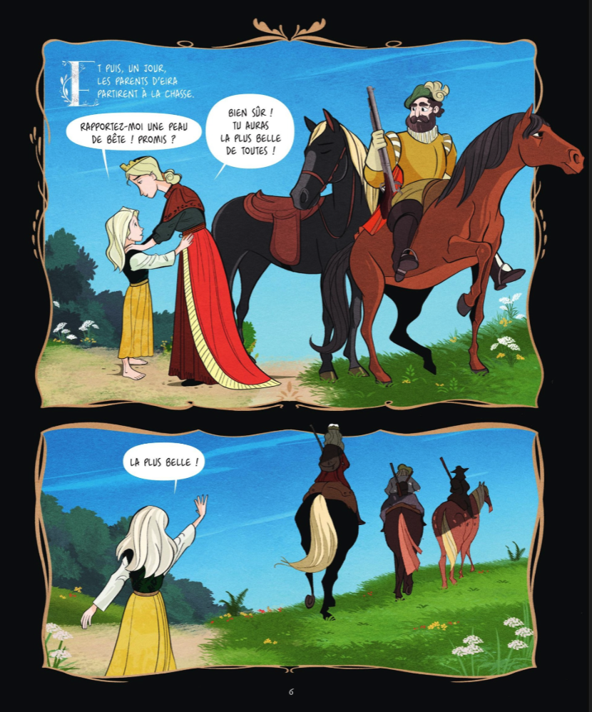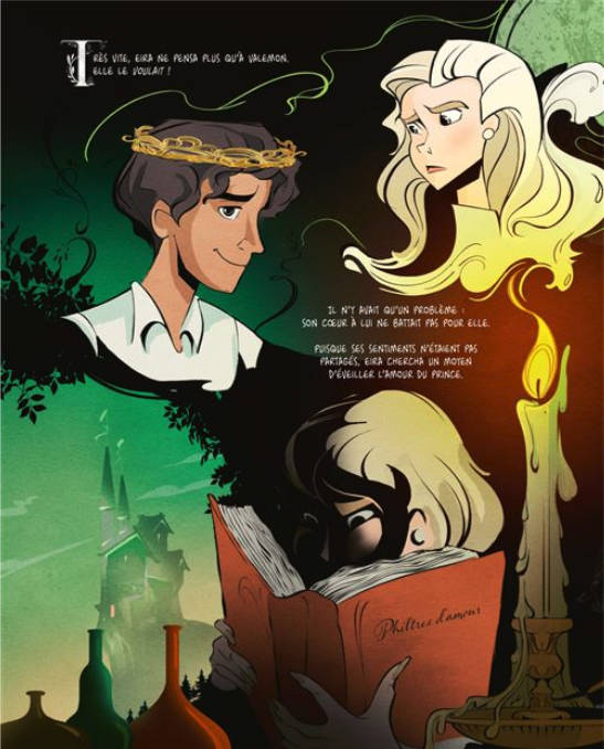 Un reinaume (un royaume où il y a une reine), la petite Eira est l’héritière. Ses parents royaux lui passent tout ses caprices et partent à la chasse. Elle veut une peau de bête la charmante enfant. Et papa, maman tuent un ours qui leur fait a eux-aussi la peau. Eira à la peau d’ours et du chagrin. Et continue à être exigeante. Valemon ne faisait que passer, jeune beau gosse que tous aimaient. Très vite il obsède Eira qui le veut à tout prix et n’hésitent pas à user de magie noire. Un philtre, des formules, de bons repas, avec sa couronne sur la tête il résiste. Ce qui agace Eira qui le transforme en ours et Valemon fuit dans la montagne. Ours le jour, homme la nuit, pas évident à gérer car si un humain le voit son visage d’homme il restera ours toute sa vie. Loin de là la jeune Liv joue avec ses animaux favoris et voudrait explorer la terre entière. Mais avec son grand-père elle doit travailler. Elle échoue dans tous les postes qu’on veut lui confier. Pas douée elle accumule les bêtises.