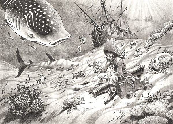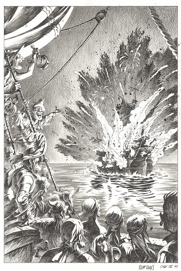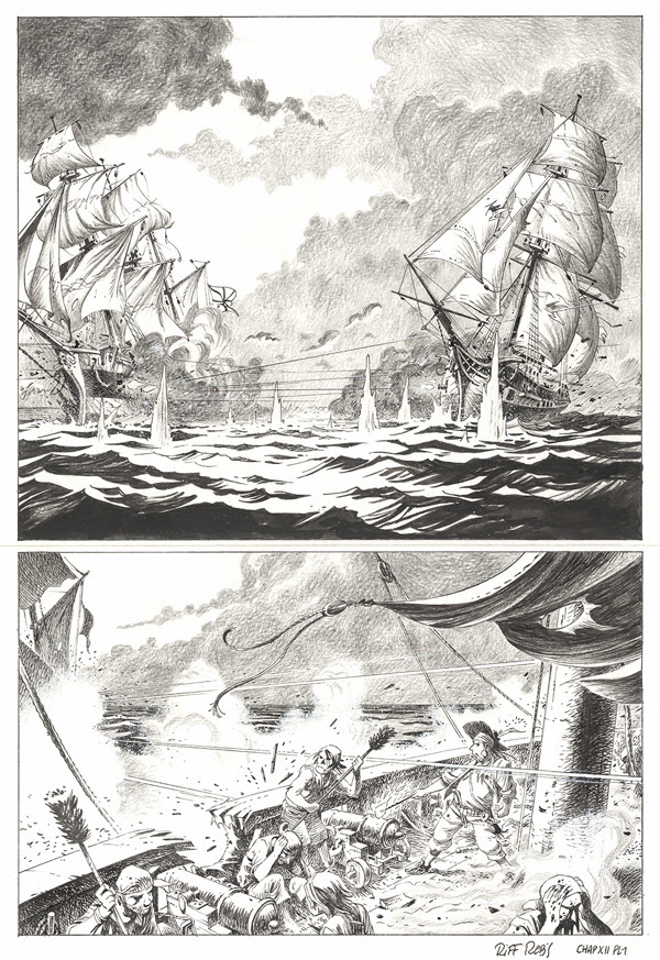 Riff Reb’s signe avec Kernok le Pirate une formidable adaptation du roman d’Eugène Sue. Une bataille après l’autre, on y suit les sanglantes tribulations du pirate Kernok. Sans foi ni loi, il parcourt les mers à bord de la « Hyène » en quête de trésors. Avec un style semi-réaliste évocateur proche de la caricature, un dessin en noir et blanc profond et des expressions de marins bien campées, Riff Reb’s nous immerge dans le monde de la piraterie. L’exposition met à l’honneur cet auteur phare de récits maritimes à travers les œuvres de ce nouvel album, notamment une série d’illustrations inédites réalisées pour l’occasion, et des originaux de ses précédents ouvrages À bord de l’Étoile Matutine, Hommes à la mer, L’Île au trésor, Le Loup des mers et Le Vagabond des étoiles.