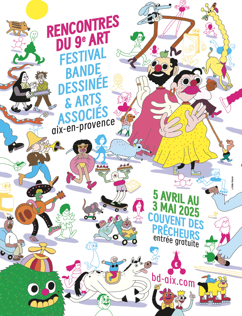 Durant un mois du 3 avril au 5 mai, le Festival BD propose de nombreux événements au cœur du Couvent des Prêcheurs mis à disposition par la Ville d’Aix-en-Provence. Un espace unique pour profiter, dès le 5 avril 2025, de ce grand village graphique, avec des expositions inédites, des ateliers pour tous les âges, des performances en direct, des projections ciné, un concert dessiné et des week-ends de fête en compagnie des artistes invités en dédicace.