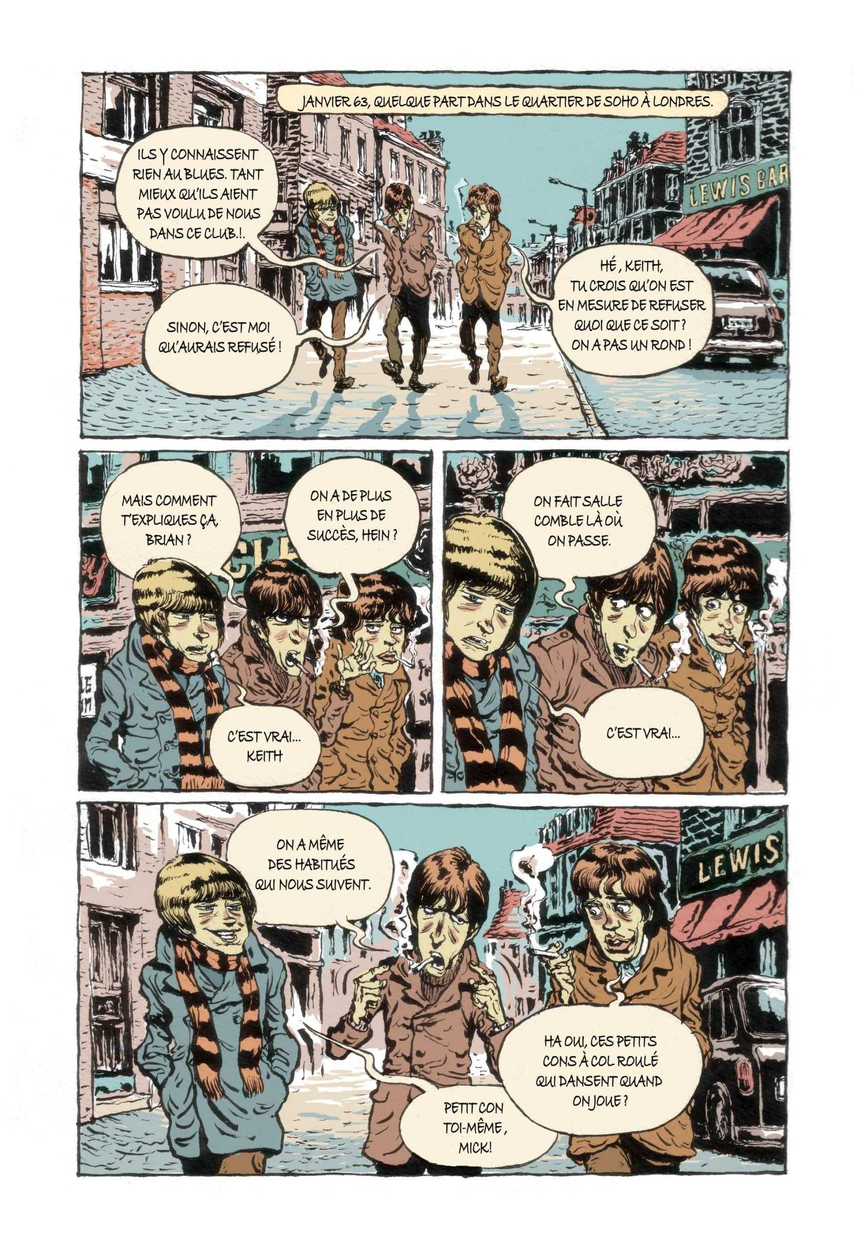 Stones ou Beatles ? Un question qui semblera aujourd’hui complètement dépassée. Elle a agité la génération du début des années soixante qui a suivi les débuts des deux plus célèbres groupes du XXe siècle. Pour tout dire les Beatles avaient la cote façon gentils garçons qui ne flanquaient pas la trouille aux parents. Les Stones étaient déjà plus sulfureux. Entre Paint it black et Help il n’y avait pas photo. Aussi cette biographie dessinée des Stones remet les pendules à l’heure, décrit par le menu comment le groupe s’est formé, l’amitié de Jagger et de Richards, le déroulé de titres qui vont faire exploser les codes, les dérapages et le grand talent, la longévité exceptionnelle, les dessous d’un mythe devenu peut-être plus fort que celui des Beatles car toujours en marche et capable de remplir les stades. Il s’y sont mis à 19 dessinateurs pour tracer la saga des Stones sur des textes de Céka. On suit à la trace ces cailloux roulants et on se dit que Stones ou Beatles finalement c’était un combat d’arrière-garde.