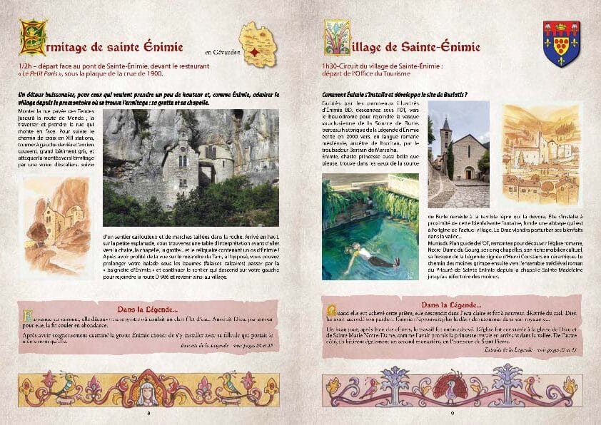 Connue pour ses activités régulières avec des auteurs et dessinateurs professionnels du monde de la BD, l’association Enimie BD publie pour cette fin d’année un Livret d’art illustré en lien avec le manuscrit médiéval de la Vida de Santa Enimia. Le pari démarre en 2021, soutenu par la DRAC Occitanie, le Conseil départemental Lozère et la Commune de Gorges du Tarn Causses. Le choix d’une première version en français va rapidement émerger. Résidences d’artiste, animations avec les scolaires et rencontres avec le grand public vont ainsi accompagner la création des 58 enluminures et 54 lettrines par Florence Magnin pour la légende de la sainte ainsi que les nombreux bandeaux par Tatiana Domas pour les balades. Elles accompagnent le texte dans une mise en page soignée, rappelant les manuscrits médiévaux. Des fiches balades conduisent le lecteur sur les traces d’Enimie accompagnées des témoignages scientifiques de Fernand Peloux et Patrick Sauzet. Enimie BD publie un superbe livret d’art autour de la légende si connue des Gorges du Tarn. Dans l’esprit BD, ces 70 pages, très illustrées, permettent de raconter une histoire tout en redécouvrant l’histoire de la cité médiévale et du Gévaudan de l’époque.