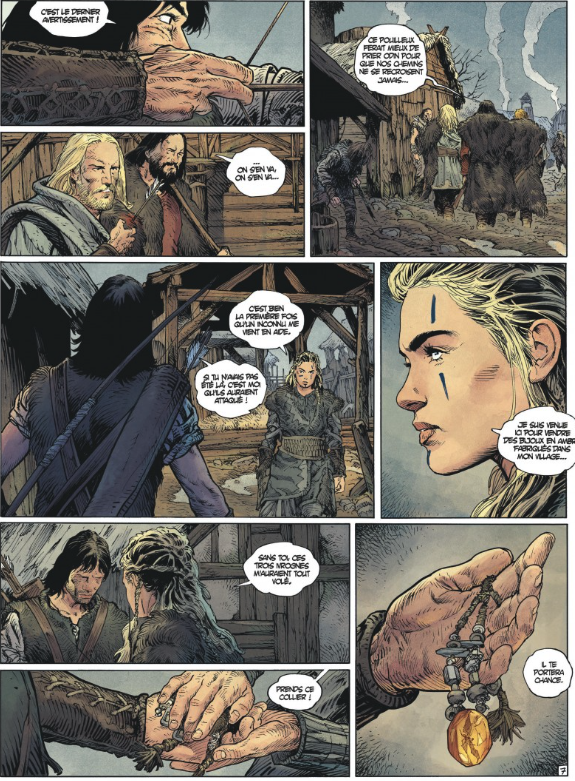 Tranquille Thorgal qui cherche une chèvre à acheter mais qui pourrait bien se faire agresser par trois hommes armés. Finalement c’est une jeune femme à qui ils s’en prennent pour lui voler son ambre (L’ambre est une résine fossile sécrétée il y a des millions d’années par des conifères ou des plantes à fleurs. Il est utilisé depuis la préhistoire dans la bijouterie et pour des vertus médicinales jamais prouvées. Sources wikipédia ndlr). Thorgal les chasse et elle lui offre un collier en ambre qu’elle vend sur les marchés. De retour chez lui auprès d’Aaricia, Jolan il offre à son épouse le collier. Mais Jolan le touche et tombe dans un sommeil profond, impossible de le réveiller. Thorgal décide de partir sur les traces de la jeune femme. Il rêve que l’esprit de Jolan est retenu dans un monde bizarre. Thorgal prend la mer, rencontre des pirates et s’échoue sur une côte montagneuse aux fumées rougeâtres dévastée par un incendie. Un village où tous sont endormis comme Jolan par le même sort. Il est assommé alors que dans son monde Jolan auprès d’une jeune déesse veut retrouver son père. Thorgal a été emprisonné par des femmes dont celle qu’il a protégé, Ingrid. Elles ont peur de leur déesse Huldra qui hait les hommes. Mais Thorgal s’enfuit.