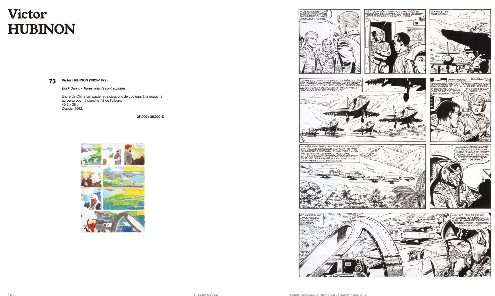Une vente chez Huberty et Breyne à Bruxelles le samedi 9 mai 2026 à 14h en live sur Drouot et sur place bien sûr 33 place du Châtelain. Comme à chaque fois avec Huberty feuilleter le catalogue est un plaisir. De belles découvertes. Des pièces qui sortent de l’ordinaire. On se dit même que la BD devenue incontournable pour les ventes aux enchères a du stock à proposer. On ne revient pas sur les estimations de prix, ceux qui seront ou pas réalisés et, attention, les frais qui s’ajoutent au final. Dans le cas d’Huberty ce n’est pas sauf erreur visible sur le dossier de presse. Généralement entre 22 et 29% plus les frais de transporteurs. A voir donc pour ne pas avoir de mauvaises surprises mais on sait que les acheteurs dans ces ventes sont des habitués. Tous les documents présentés sont la propriété de Huberty et Breyne DR.