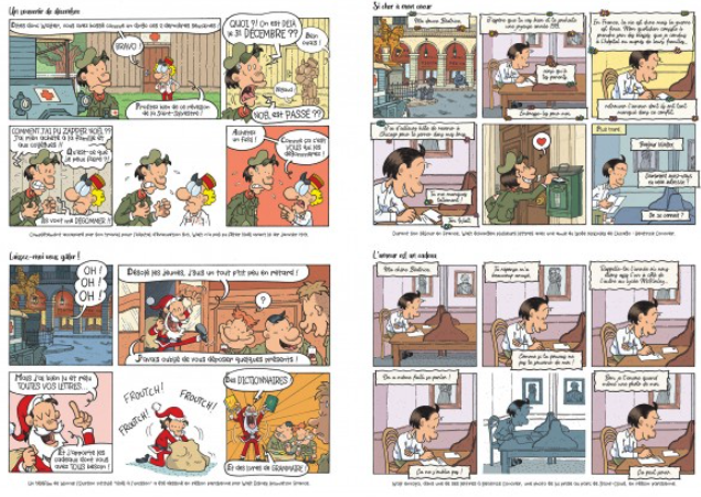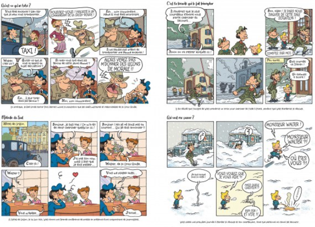 Il faut absolument lire les notes sous les strips. On y apprend plein de choses amusantes qui montrent que l »inspiration peut se cacher n’importe où. On y parle de la guerre, des hôpitaux, de la gestion des blessés et évidemment des productions de tonton Walt. Il rencontre Louis Lumière à l’Hôtel de Crillon où il revient en 1935. Il sera quand même par erreur accusé d’abandon de poste et de véhicule. Une chronologie termine l’album. On y découvre aussi qu’en 2019 la société Disney a versé 5 millions de dollars pour remettre en état Notre-Dame. Des anecdotes savoureuses qui ont valeur de témoignages pour la mémoire.