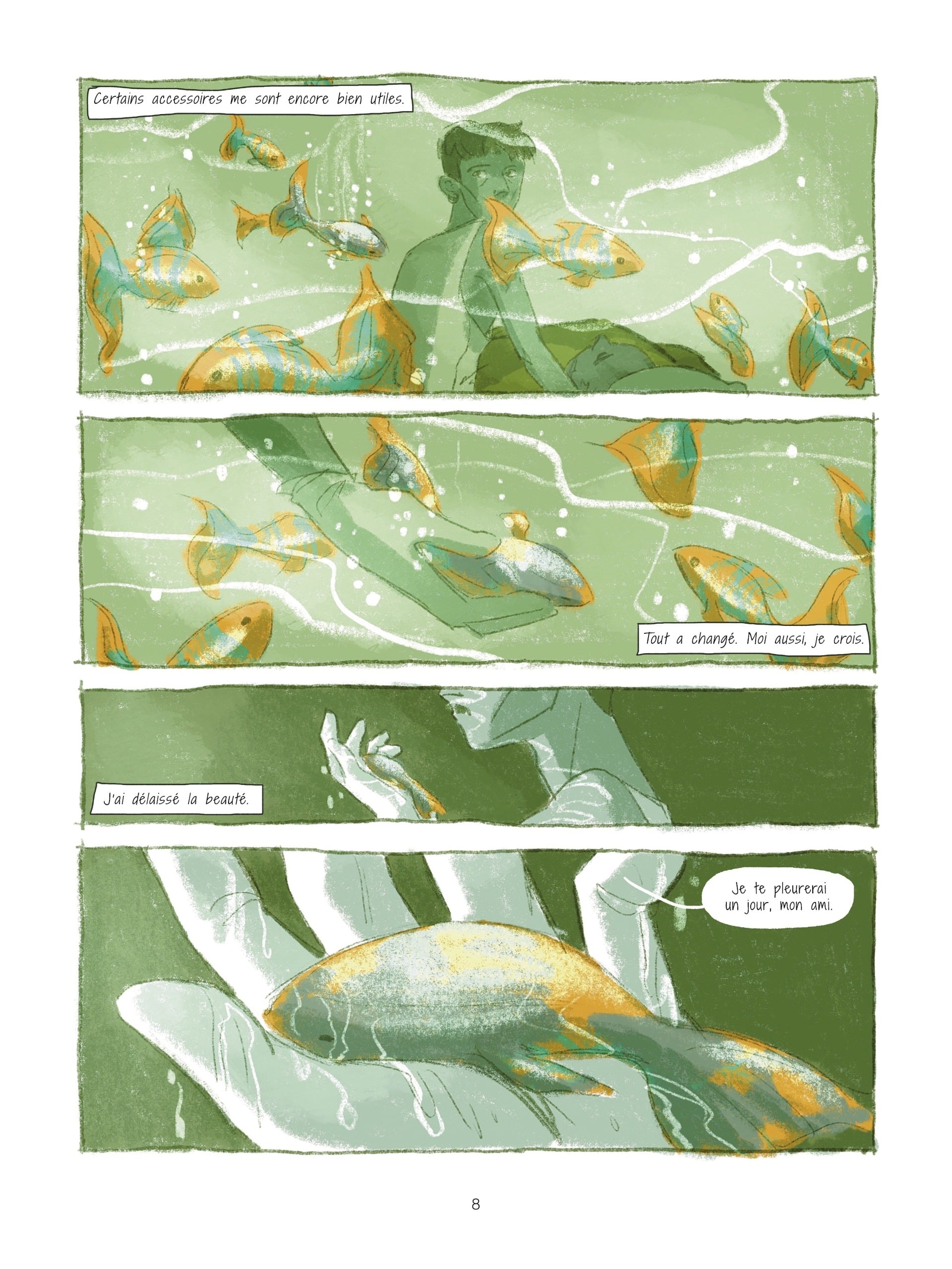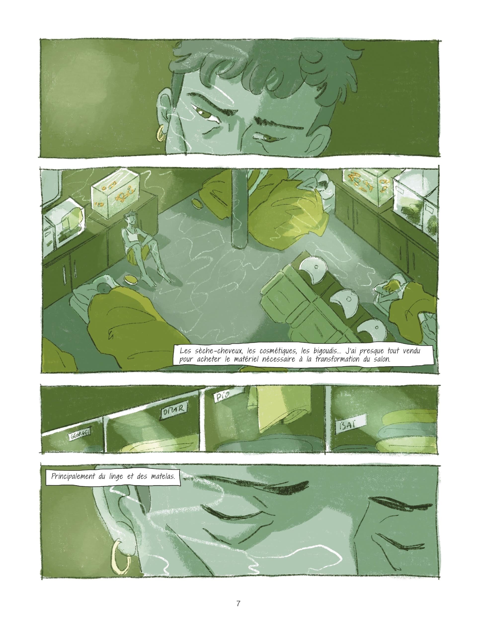 Quentin Zuttion est au scénario (Toutes les princesses meurent après minuit) et dessin de Salon de beauté. Un aquarium où il y a encore des poissons multicolores vivants. Un homme, Jeshua, se penche sur son ami mourant, Isai, le corps couvert d’écailles, comme un cancer de la peau. On est dans un salon de beauté transformé en une sorte de clinique ou de mouroir. Et comment en est-on arrivé là ? Beauty Fish est dirigé par Jeshua qui a des clientes fortunée et un personnel gay, Isai, Alex. Le fils d’une cliente cherche un job mais pas possible. Difficile de vivre son homosexualité pour le trio. Jardin public, prostitution et pour la première fois dans l’aquarium un poisson meurt et se fait dévorer par les autres. Que faut-il faire ? Si c’est contagieux tous sont condamnés. La vendeuse conseille à Jeshua de leur créer des caches avec des rochers. Mais toujours se cacher ce n’est pas une vie. Victor le fils de la vendeuse accompagne Jeshua dans la réserve, coup de foudre. Et début de curieux symptômes. Des écailles et la peur des « autres ». L’adaptation du roman de Mario Bellatin montre là aussi comment le sida a décimé la communauté gay, niée par ailleurs mais la vision que restitue Zuttion est onirique, parsemée aussi de douceur poétique malgré la tragédie.
