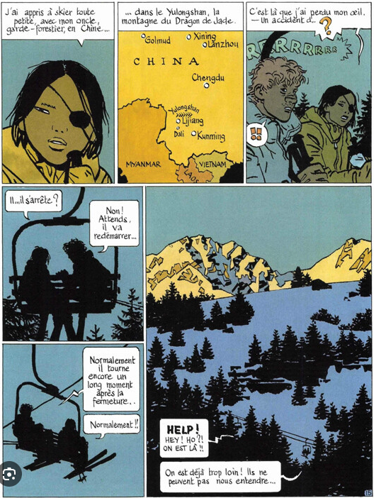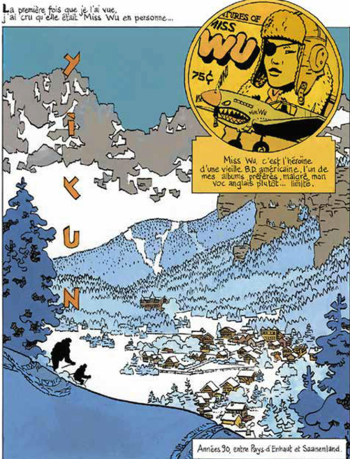 Papiers découpés, depuis toujours, avec ciseaux ou lames de bistouris l’art ne s’est jamais éteint. Il y a eu un certain Cadet Roussel, celui de la chanson ?, qui en a été un des maîtres. Paysages souvent en vis à vis semblables, scènes de la vie quotidienne, direction la Suisse au XIXe siècle dans la préface. Et ensuite Maou se présente dans le prologue en BD. Trouvée dans le port de Shanghaï, enfants chinois adoptés, elle partira en camp de ski comme la héros du livre Yiyun. Trouvera Cosey et va collaborer avec lui qui lui demandera une préface. Carnet de dessins en ouverture alors que généralement en fin, belle mise en oeuvre des personnages. Urs, Mei, Helmut, Sybil, Zuo, calligraphies et premier découpage. Urs voit pour la première fois Mei au ski et la prend pour Miss Wu héroïne de BD, bandeau sur l’oeil qui pilote un P-40 dans les Tigres Volants. Années 90 au Pays d’Enhaut, dans les Alpes vaudoises, Urs, 14 ans, croit reconnaître Miss Wu. Un sosie à qui il veut parler. Ce sera sur un télé siège, enfin. Une panne et ils vont parler, échanger leur premier baiser avant que les secours n’arrivent. Urs a une moment Cornelia chanteuse puis rockeuse. Pour se faire un peu d’argent Urs découpe et vend ses travaux. Les Alpes, les vaches, les touristes aiment. Il renouvelle les sujets fan de BD. Mei repart en Chine. Urs explique ses découpages. Un an plus tard, retrouvailles.